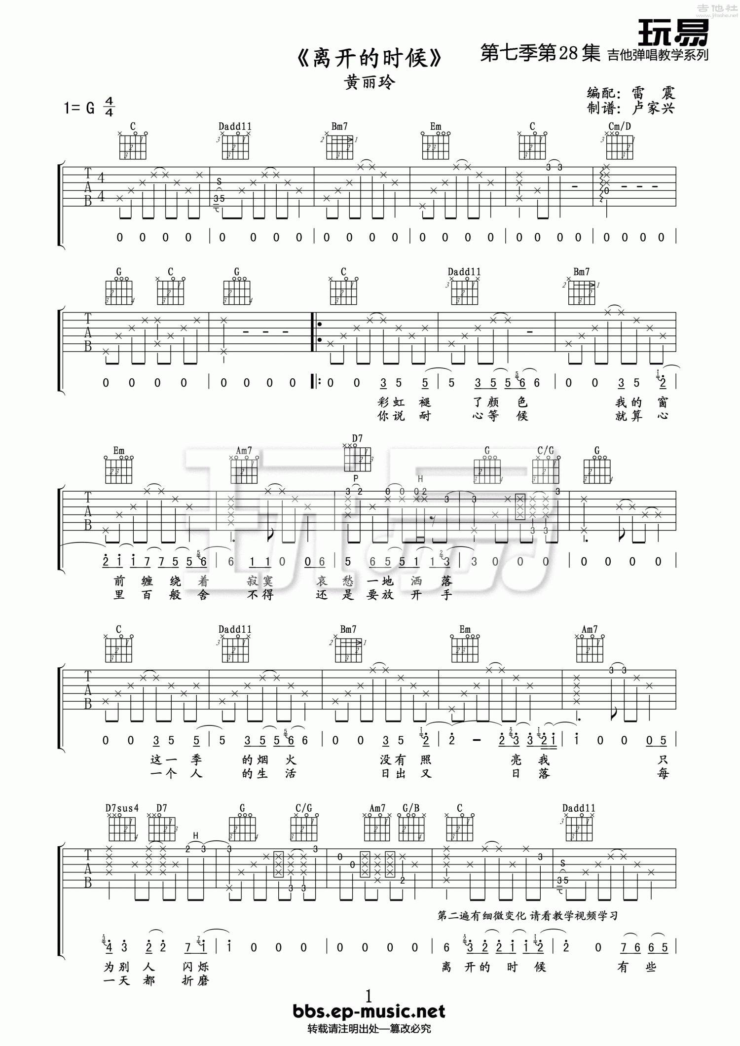 曲谱介绍: G调版《离开的时候》吉他弹唱六线谱