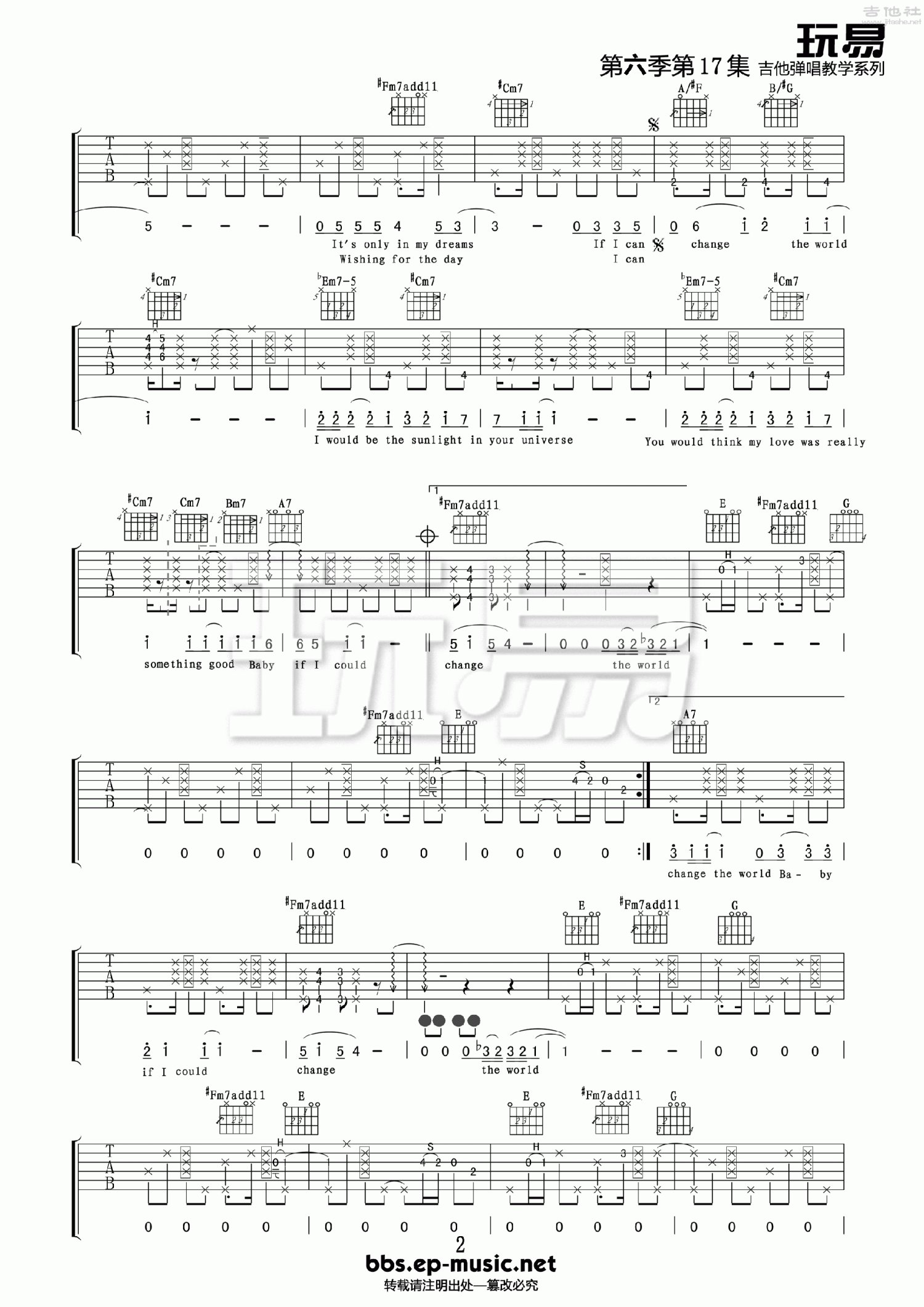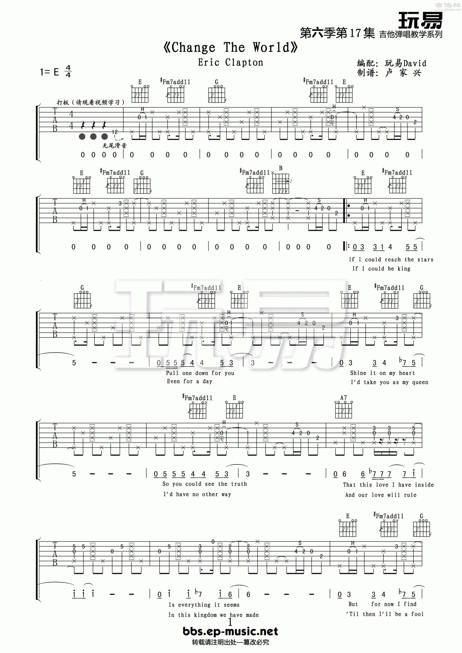 曲谱介绍: E调版《Changetheworld》吉他弹唱六线谱