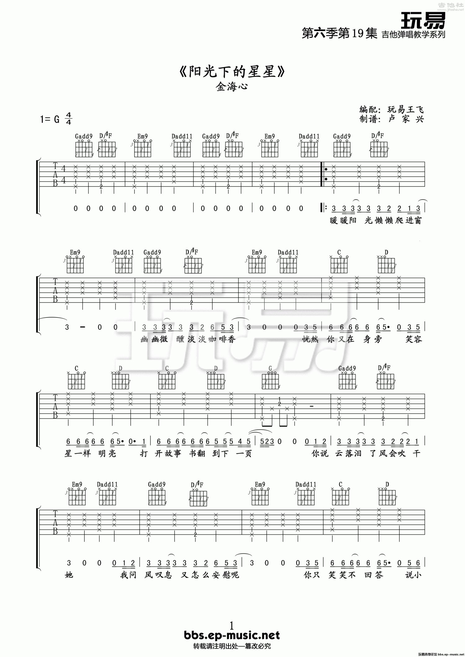 曲谱介绍: G调版《阳光下的星星》吉他弹唱六线谱