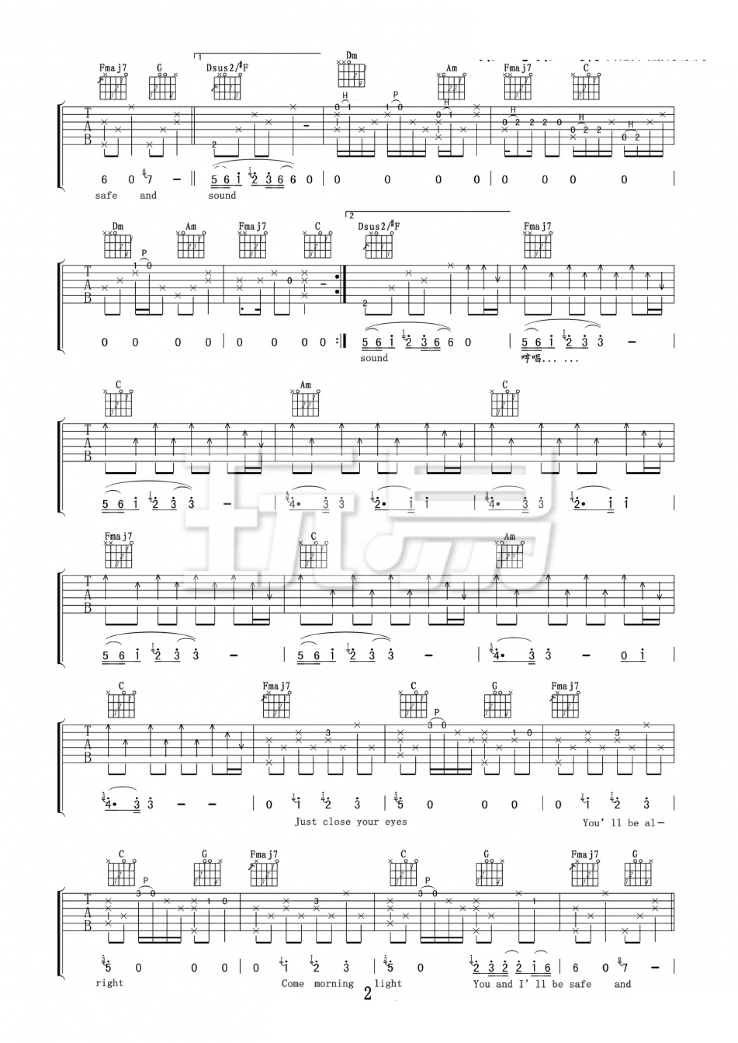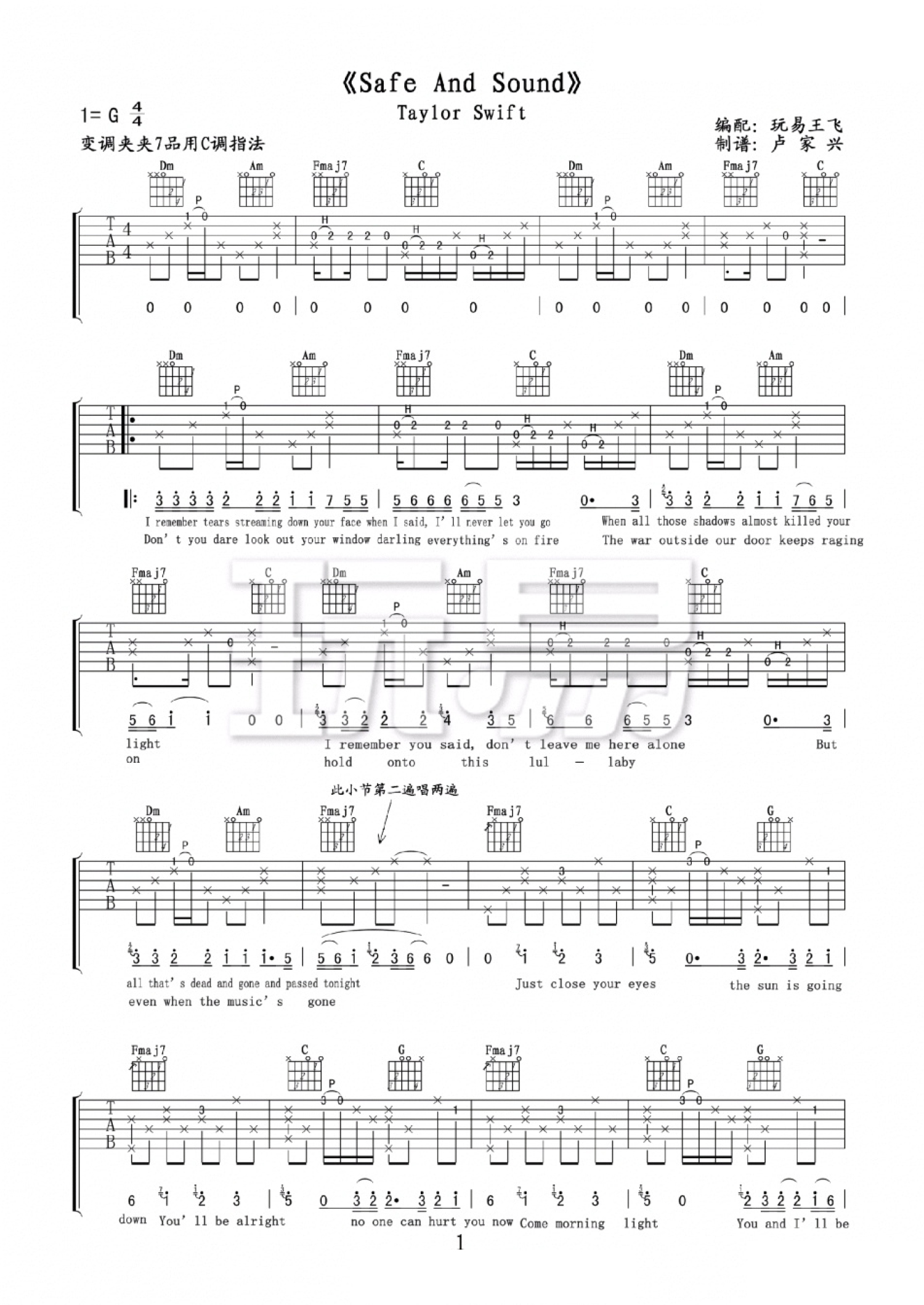 曲谱介绍: C调版《Safeandsound》吉他弹唱六线谱