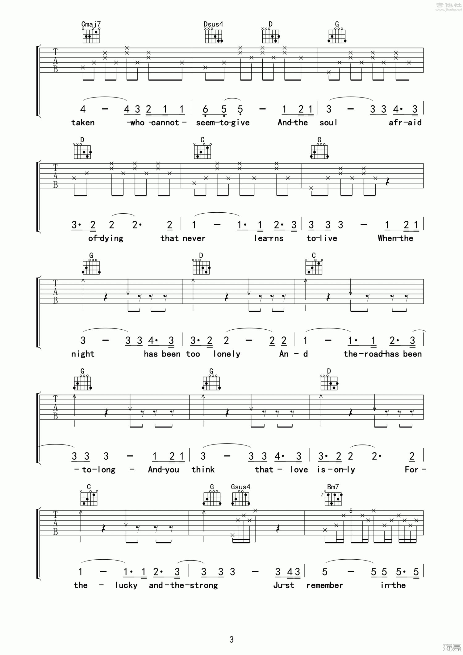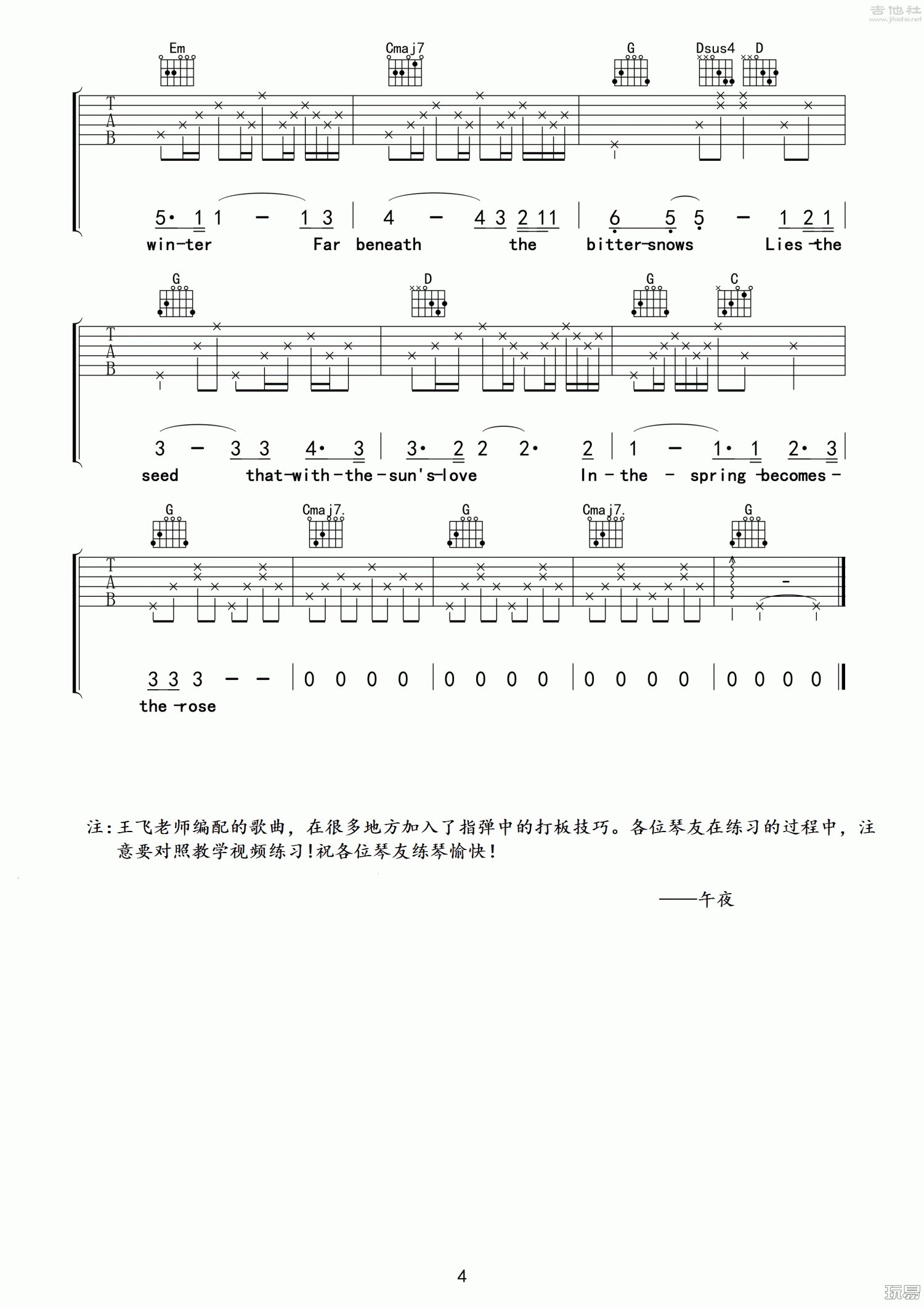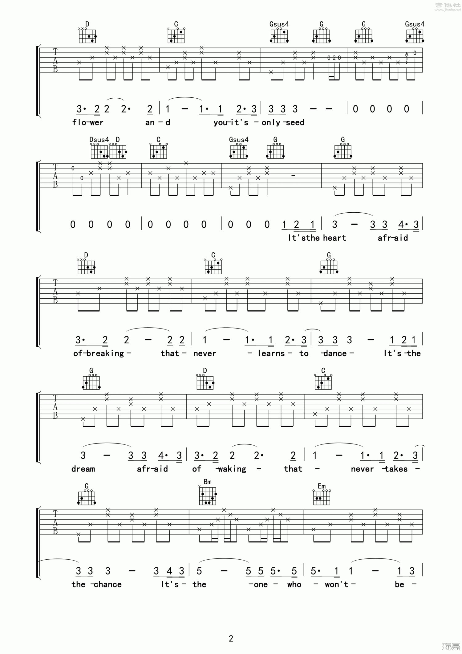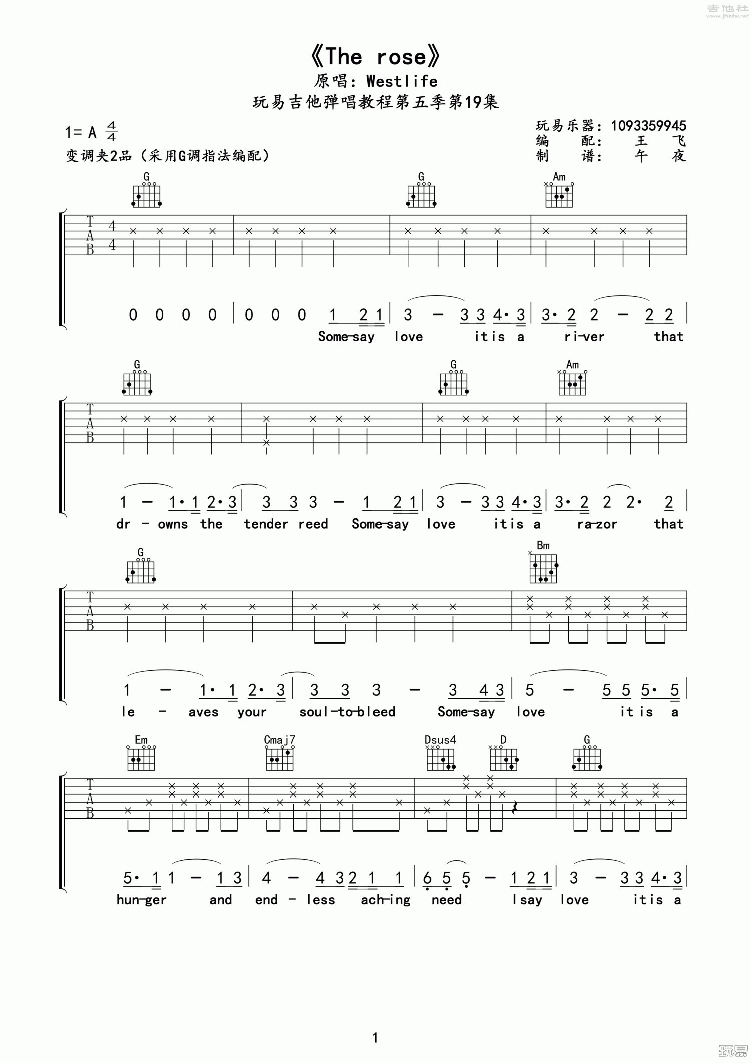 曲谱介绍: G调版《TheRose》吉他弹唱六线谱