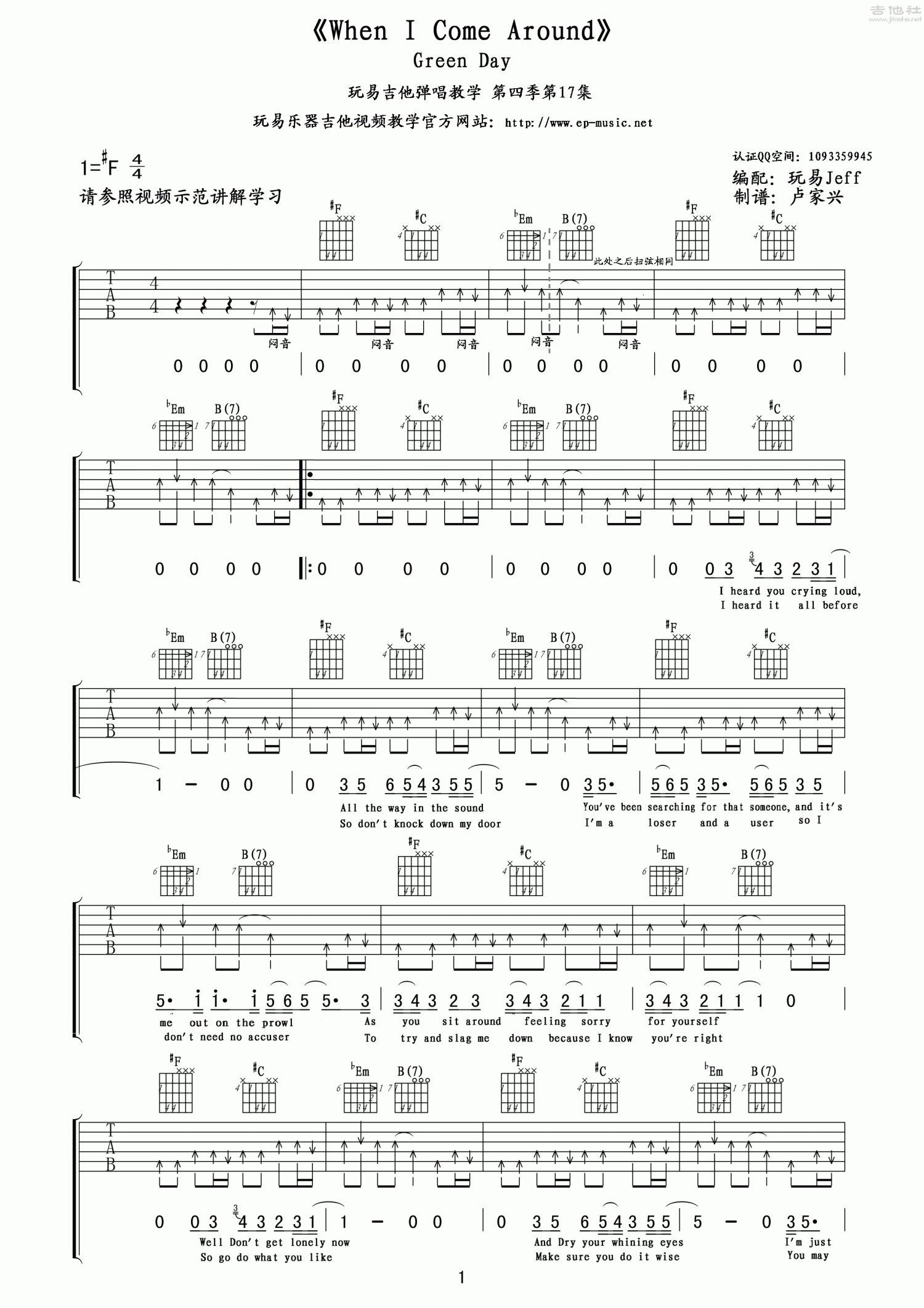 曲谱介绍: #F调版《WhenIComeAround》吉他弹唱六线谱