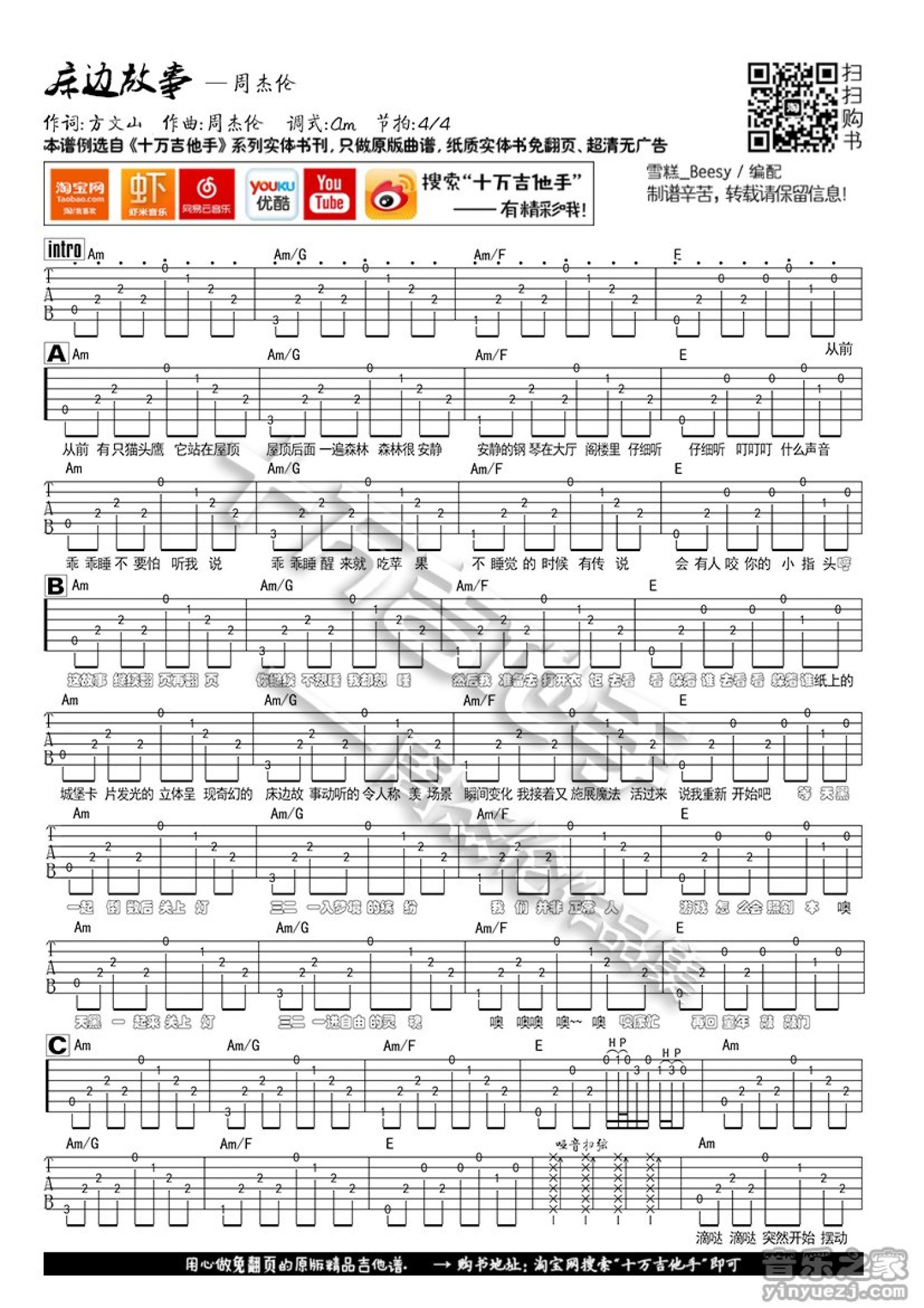 曲谱介绍: C调版《床边故事》吉他弹唱六线谱