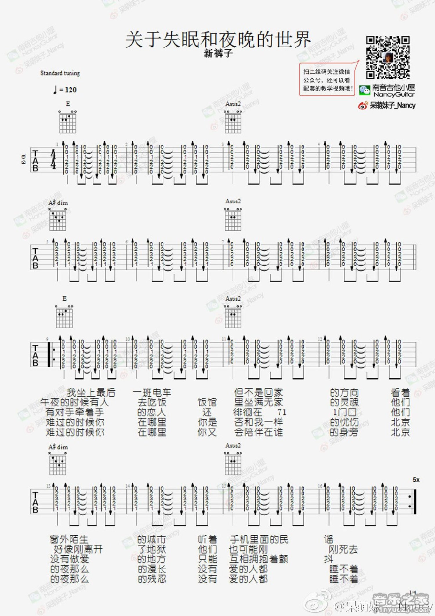 曲谱介绍: 南音六线版《关于失眠和夜晚的世界》吉他谱