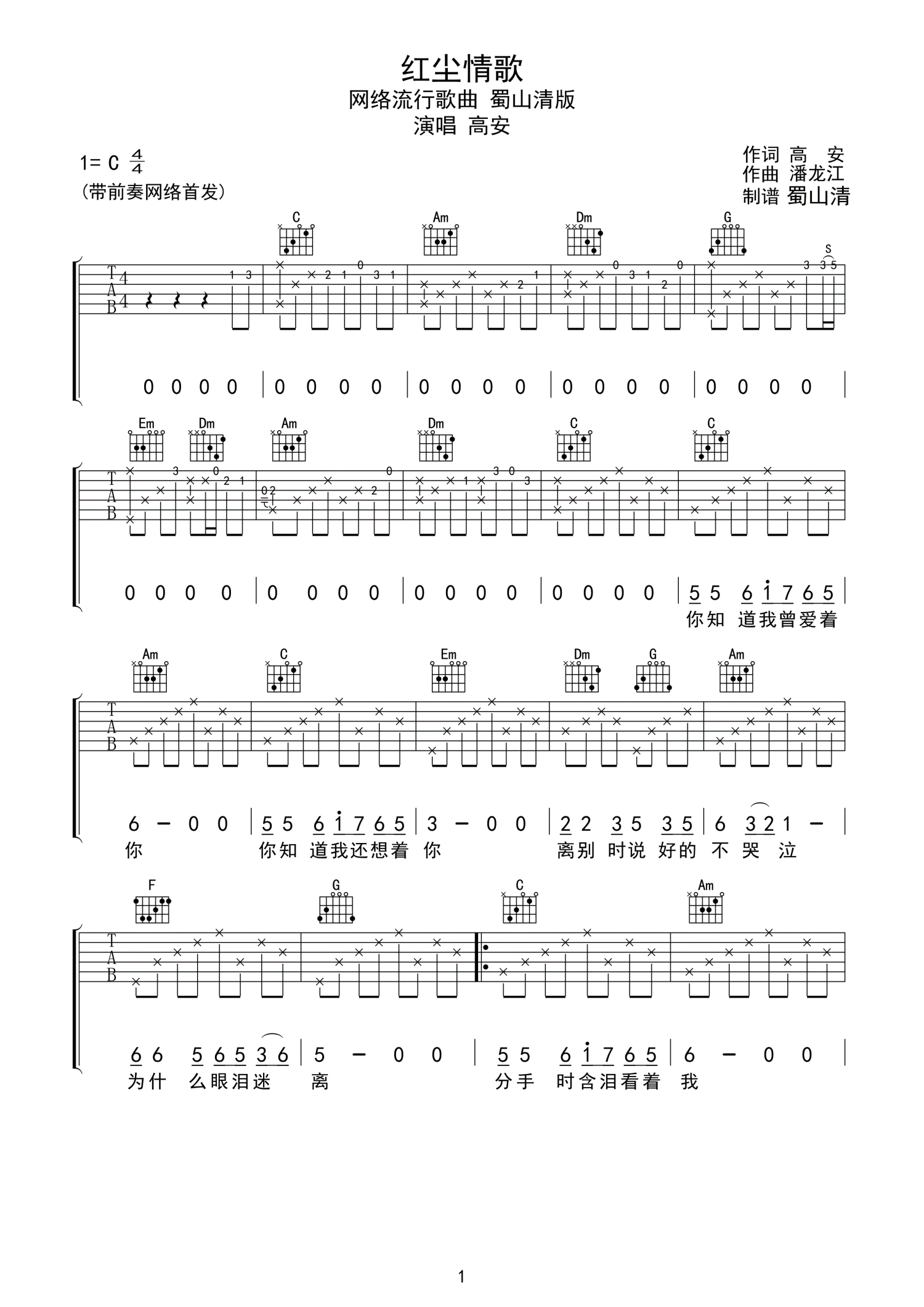曲谱介绍: 高安的红尘情歌吉他谱,蜀山清编配完整版带前奏,C调和弦指法红尘情歌这首网络热门歌曲很多翻唱,也是一首很受欢迎的吉他弹唱歌曲,今次送上红尘情歌六线谱版本希望琴友们喜欢。