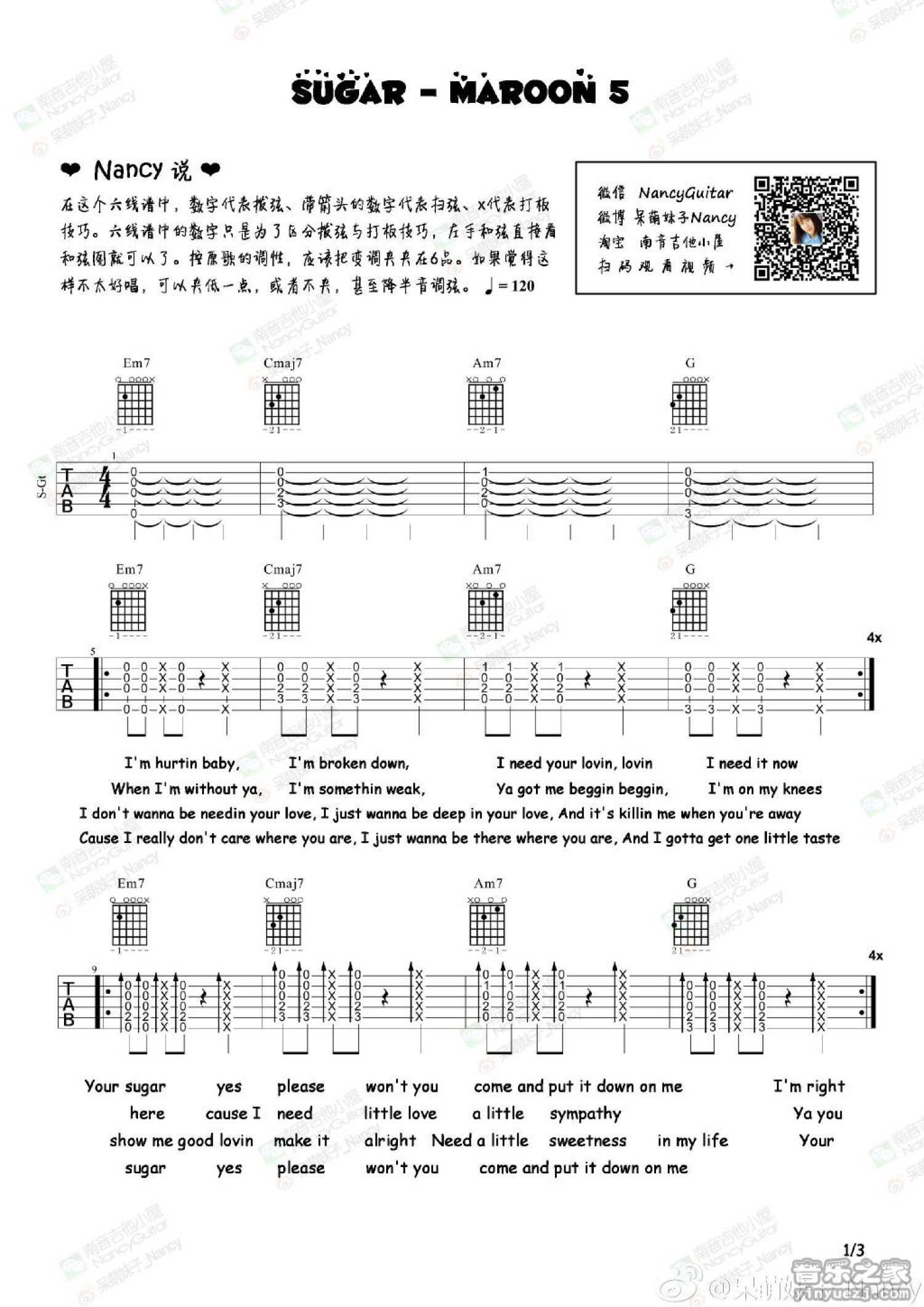 曲谱介绍: maroon5《sugar》吉他谱_吉他弹唱谱