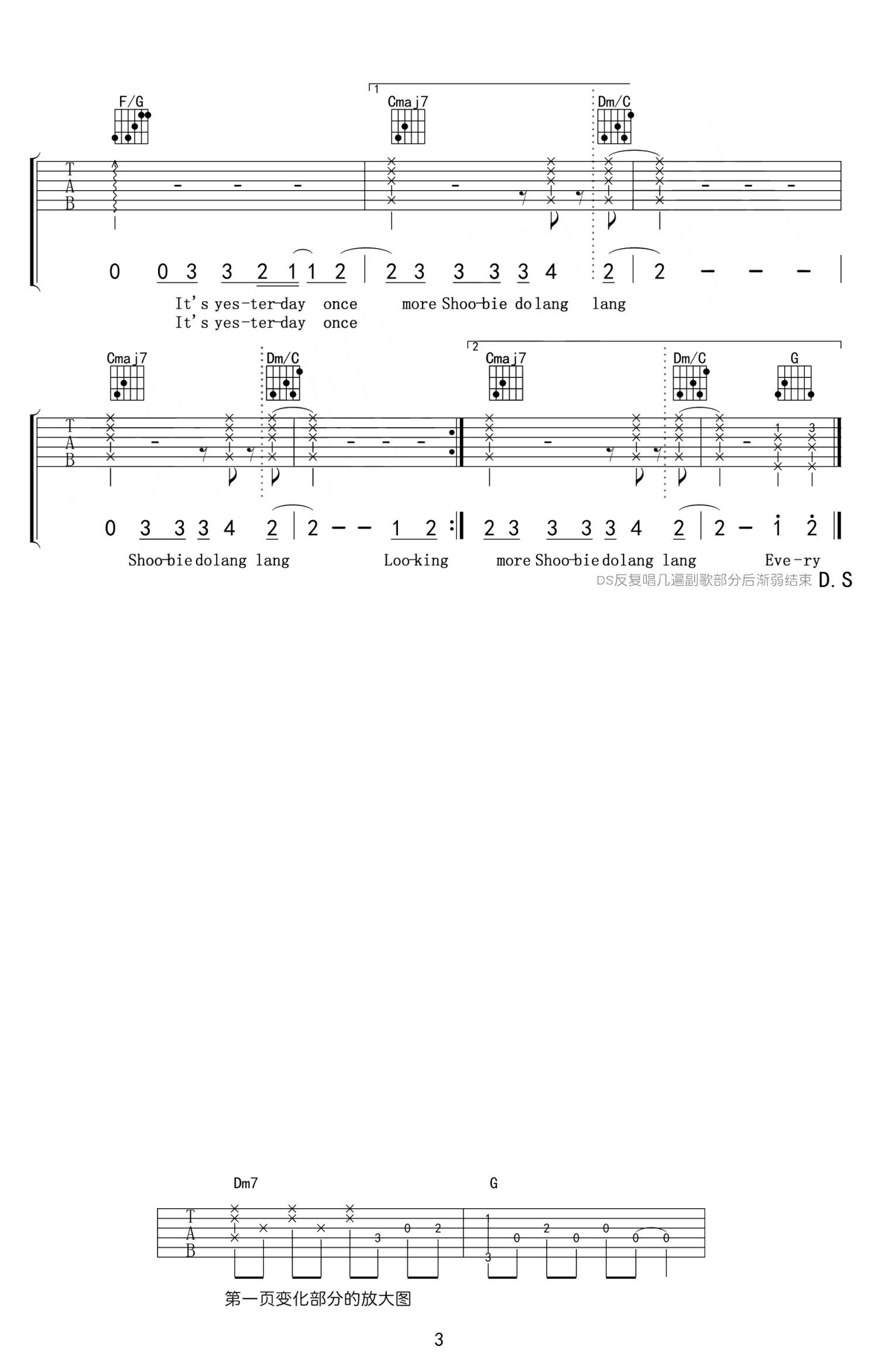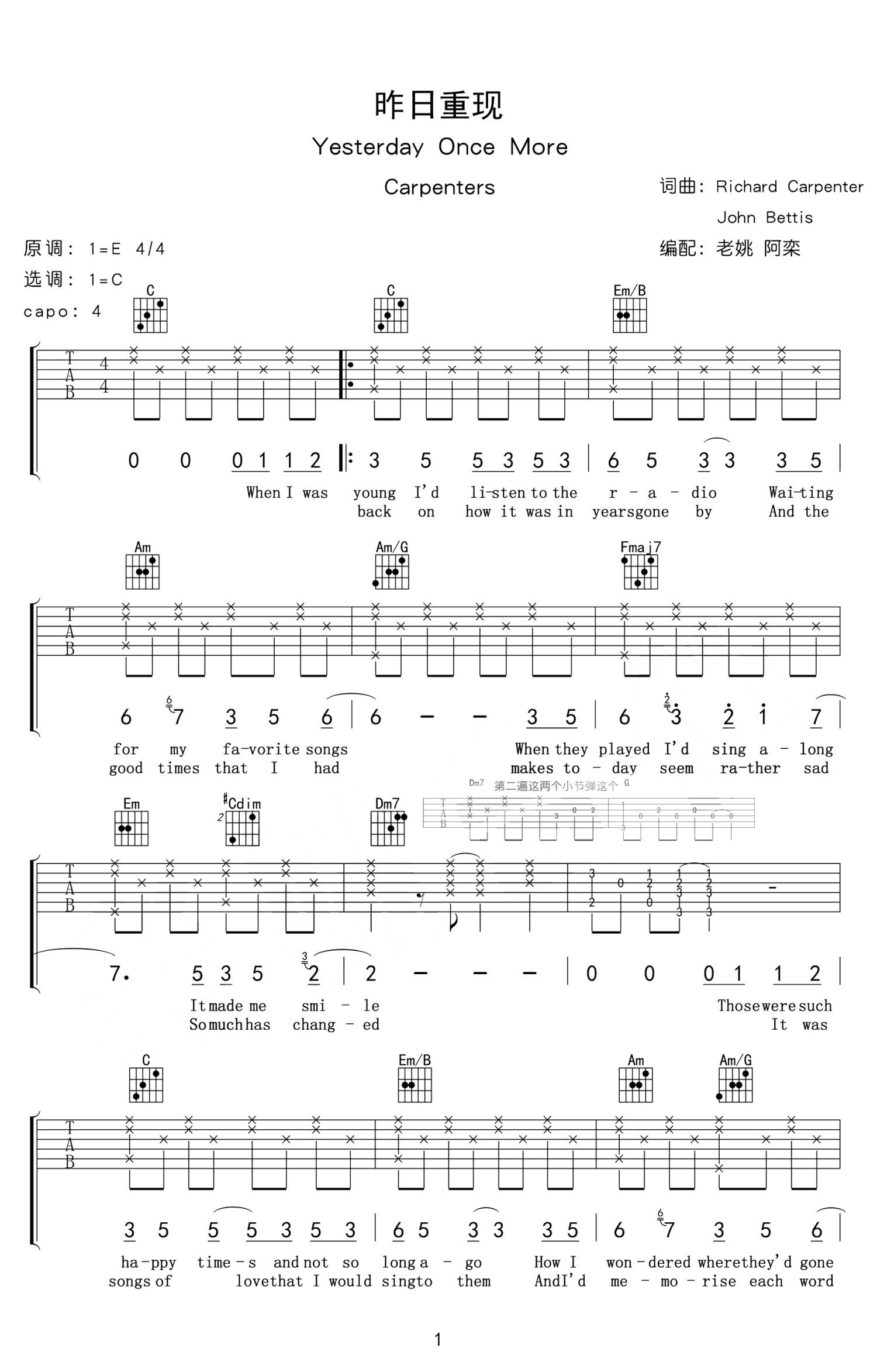 曲谱介绍: 昨日重现吉他谱,Carpenters兄妹组合演唱的一首经典英文歌曲,YesterdayOnceMore吉他谱,原调E,选调C,变调夹夹四品。老歌的旋律,总能轻易深入人心。一首YesterdayOnceMore也是无数人对英文歌的最初记忆。每一次前奏响起,每一个旋律跳动,都直敲心脏。听这首歌,总是很容易怀念起过去。曾经的美好时光,曾经的亲密挚友,曾经的爱恋,仿佛就在昨天,那时阳光尚好。今日歌声再起,便如挚友相见。随谱附上《昨日重现》吉他教学视频,喜欢这首歌曲的琴友们,跟随老师的示范讲解练习起来。