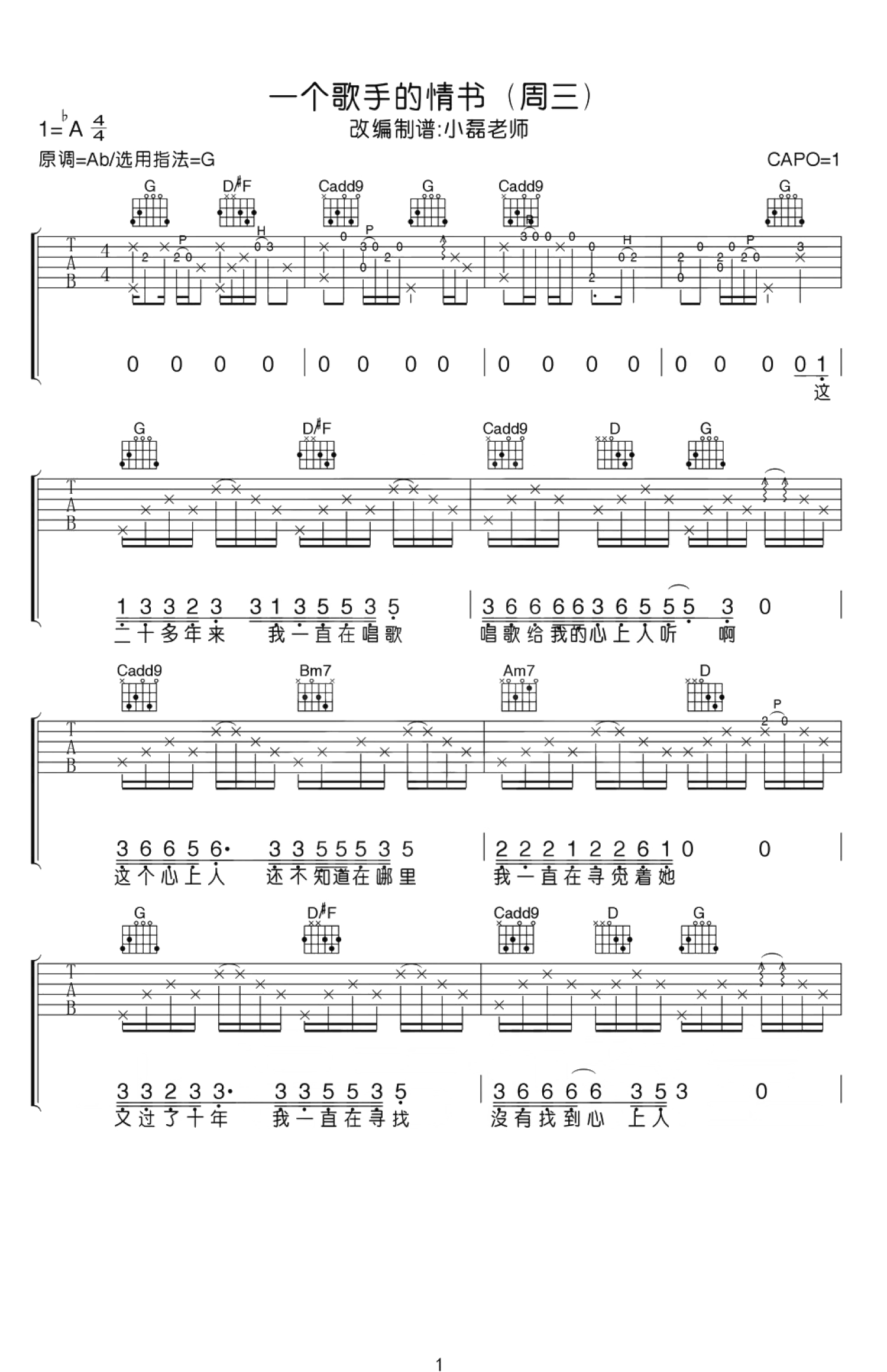 曲谱介绍: 一个歌手的情书吉他谱,周三演唱,中国好歌曲原创优秀曲目,平淡朴实却充满力量。一个歌手的情书六线谱,原调AB,选用G调指法,变调夹夹第一品。编配说明:目前能听到的只有两个版本,一个是周三本人的现场版,另一个是蔡健雅和周三合唱的版本,老师参考的是周三的现场版,把前奏全无保留的扒了出来,虽然原版中有很多即兴成分,但是还是很值得学习的,前奏的学习重点在节奏!主歌与副歌的弹唱部分,老师改编的难度不高!间奏是由口琴改编过来,和前奏也有些类似!难度:6级