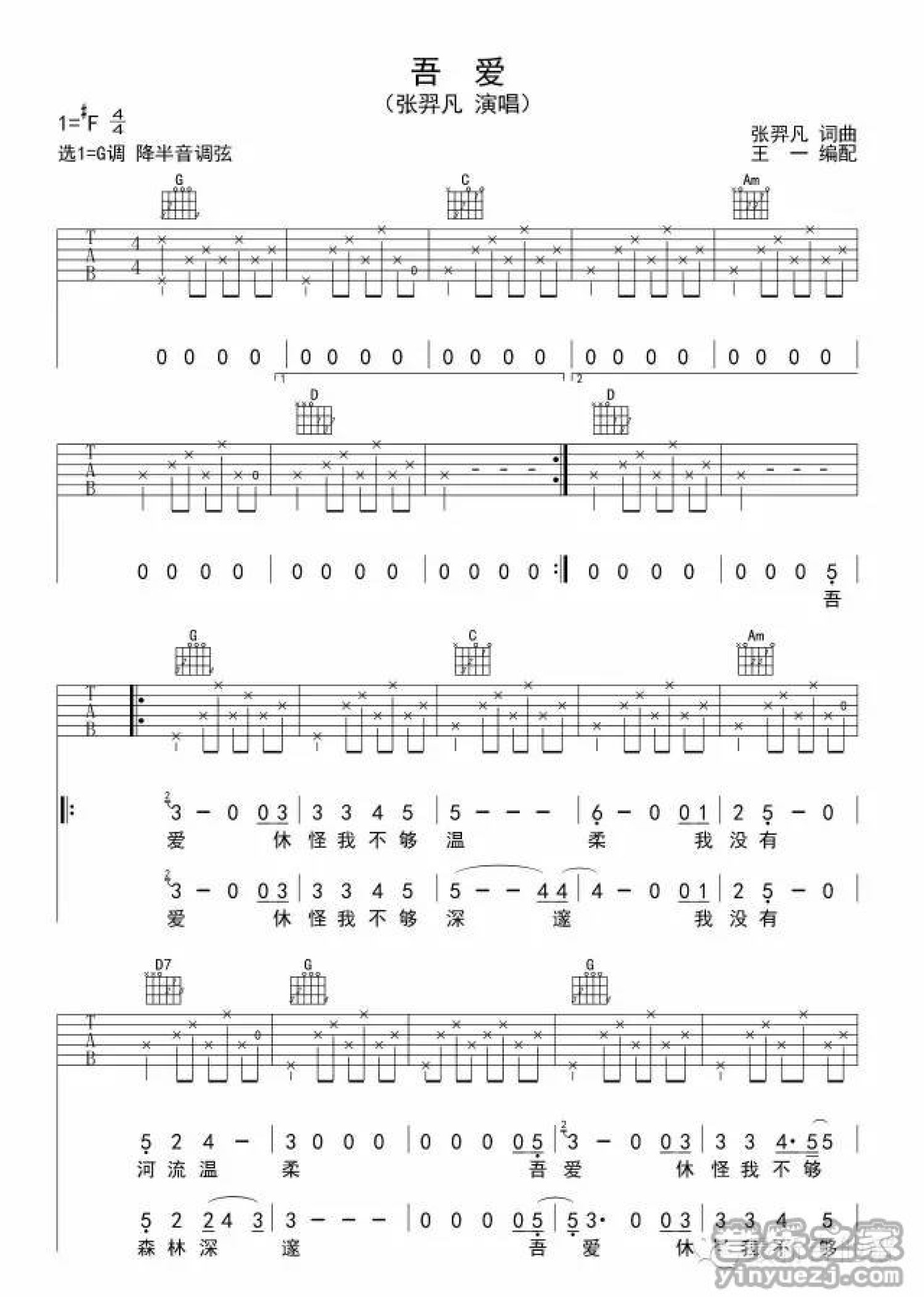 吾爱吉他谱 - 张羿凡 - G调吉他弹唱谱