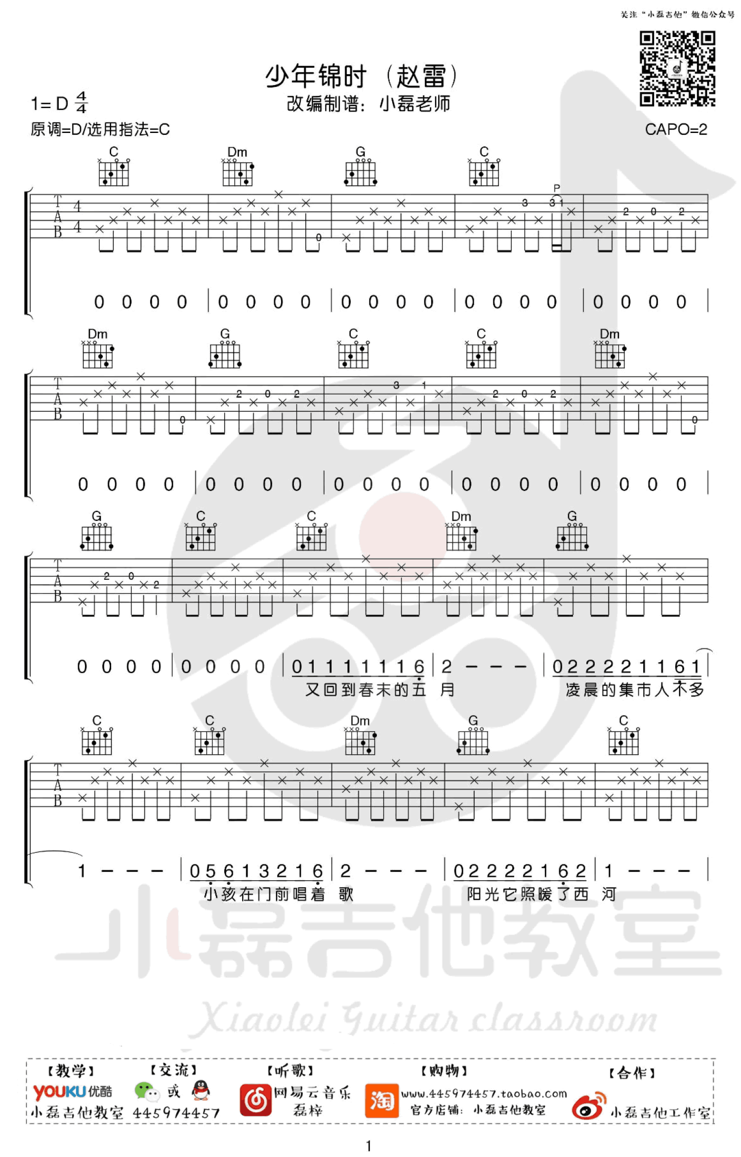 曲谱介绍: 《少年锦时》吉他谱,赵雷的一首原创民谣歌曲,原调D,选用C调指法,变调夹夹二品。随谱附上配套吉他教学,喜欢赵雷这首歌曲的琴友们参照老师的示范讲解练习起来。编配说明:对于初学者来说,这首歌可能会稍微有些小难度​,但是老师通过改编把这首歌的色彩和前奏的那些小旋律也保留了下来。间奏整体算是还原度90%以上,因为间奏是双吉他的​,这里完成了在一把吉他的版本里,是完整的把间奏的旋律呈现的很完美的一个编排​。后段采用扫弦,托起整体歌曲的这个氛围,所以说这首歌整体来说比较丰富,推荐大家去学习​。
