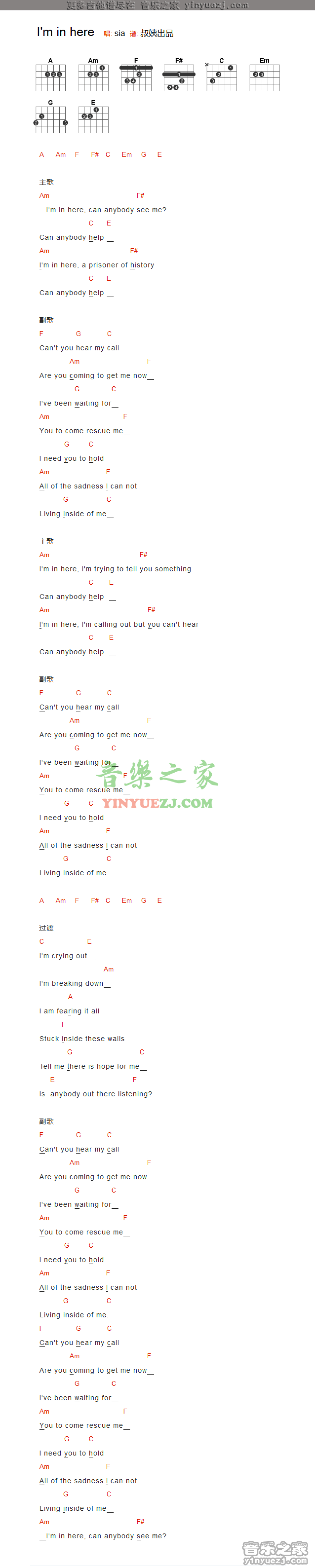 曲谱介绍: Sia《I'm In Here》吉他谱_吉他弹唱谱_和弦谱