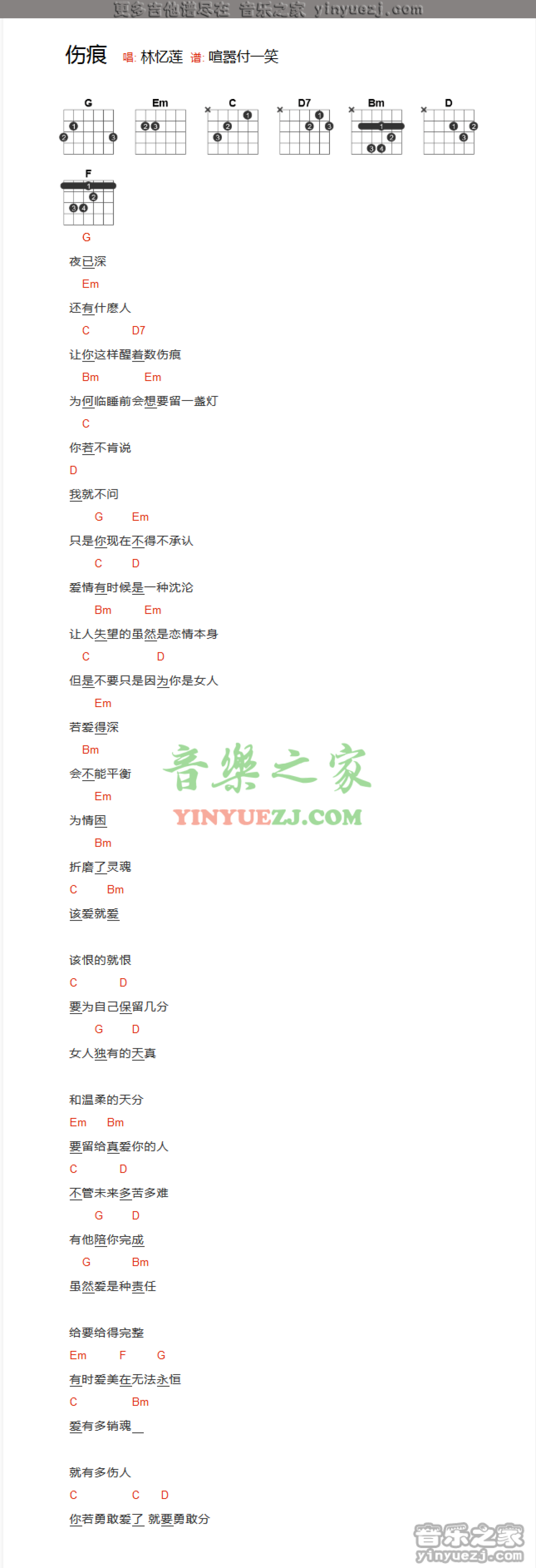 曲谱介绍: 林忆莲《伤痕》吉他谱_吉他弹唱谱_和弦谱