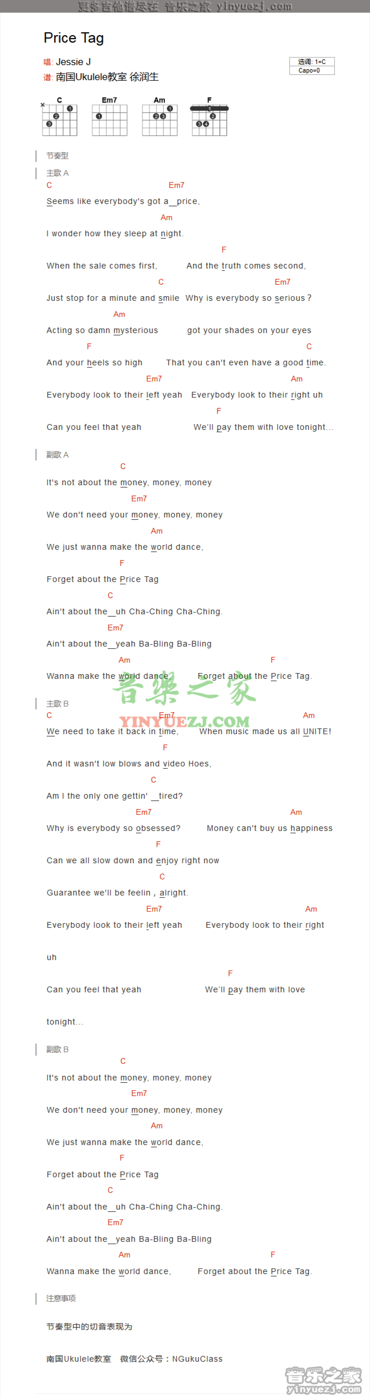 曲谱介绍: jessiej《price tag》吉他谱_C调吉他弹唱谱_和弦谱
