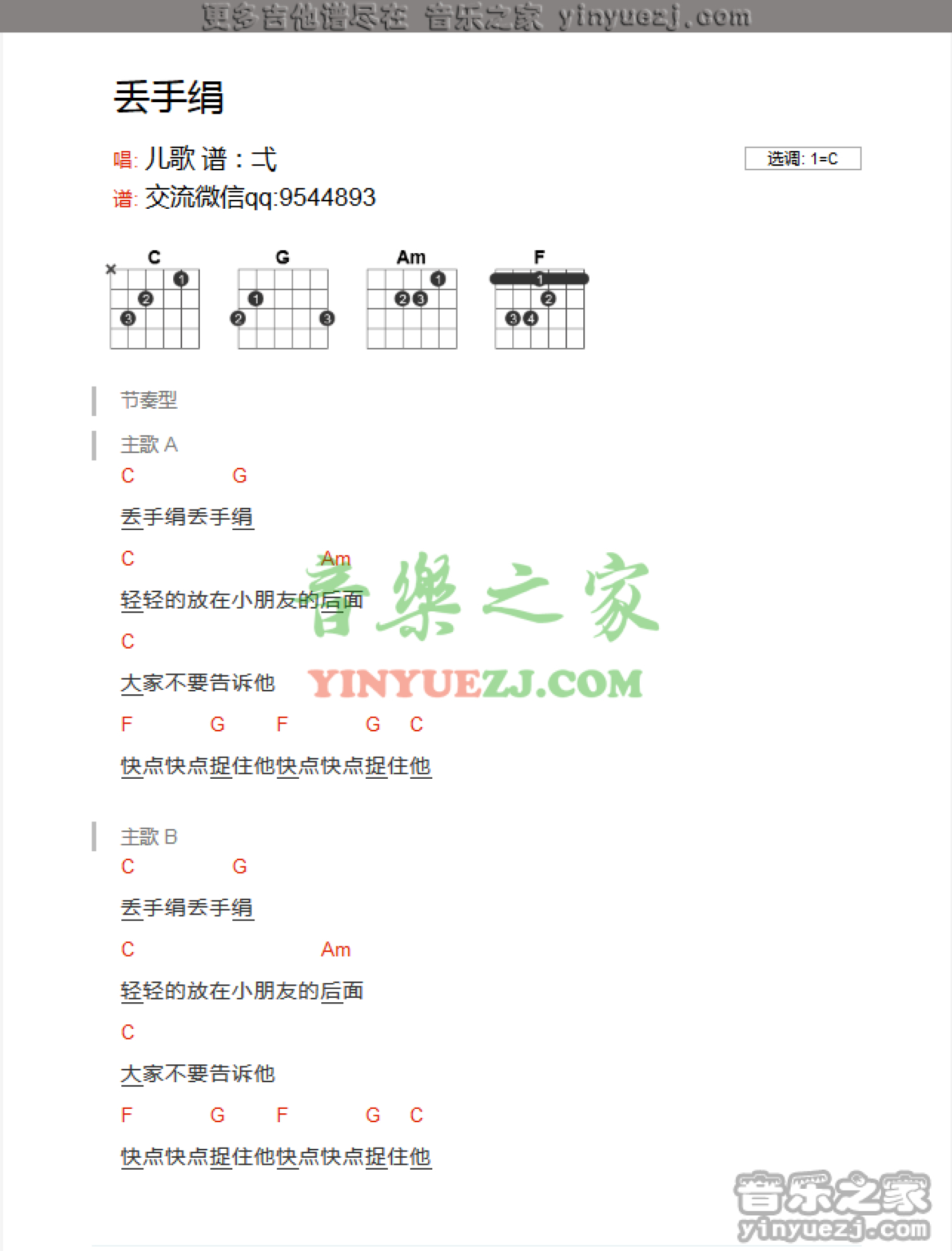 曲谱介绍: 儿歌《丢手绢》吉他谱_C调吉他弹唱谱_和弦谱