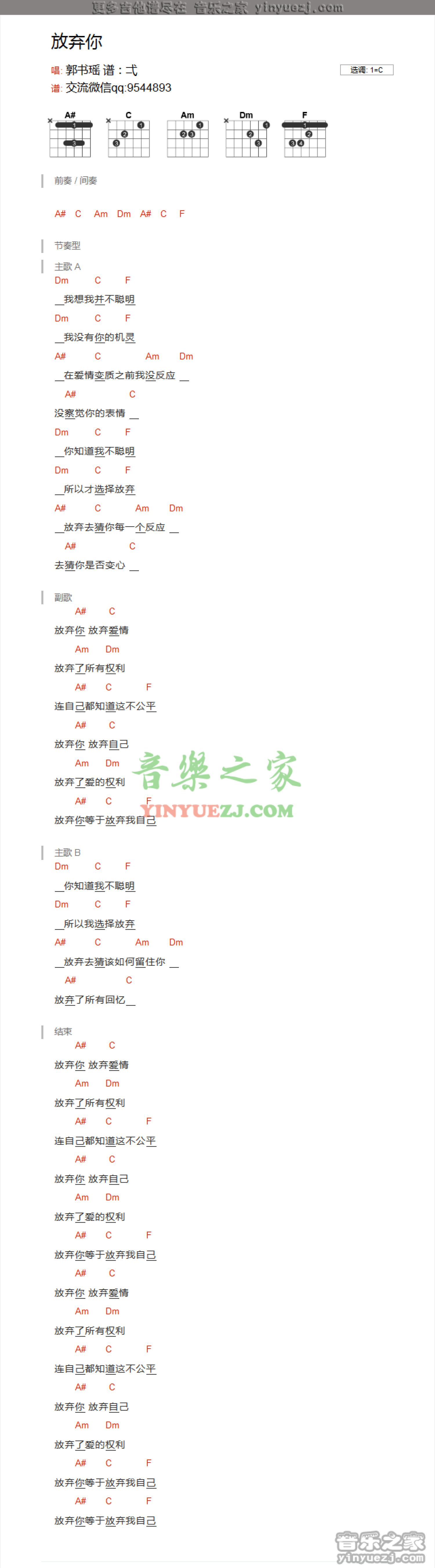 曲谱介绍: 郭书瑶《放弃你》吉他谱_C调吉他弹唱谱_和弦谱