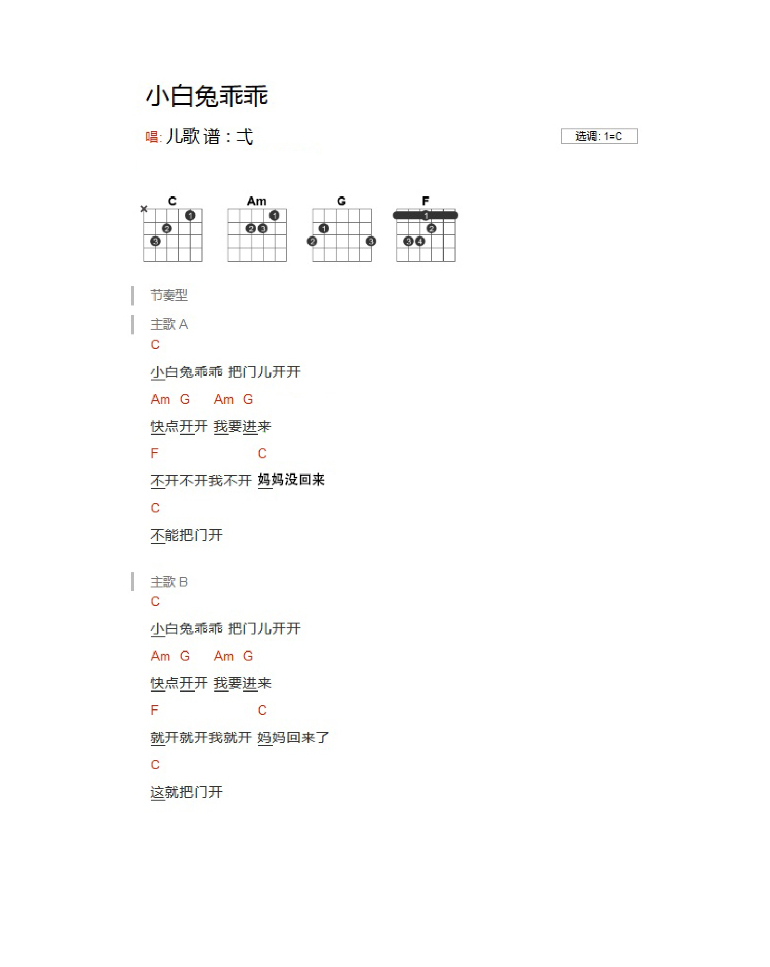 曲谱介绍: 儿歌《小兔子乖乖》吉他谱_C调吉他弹唱谱_和弦谱