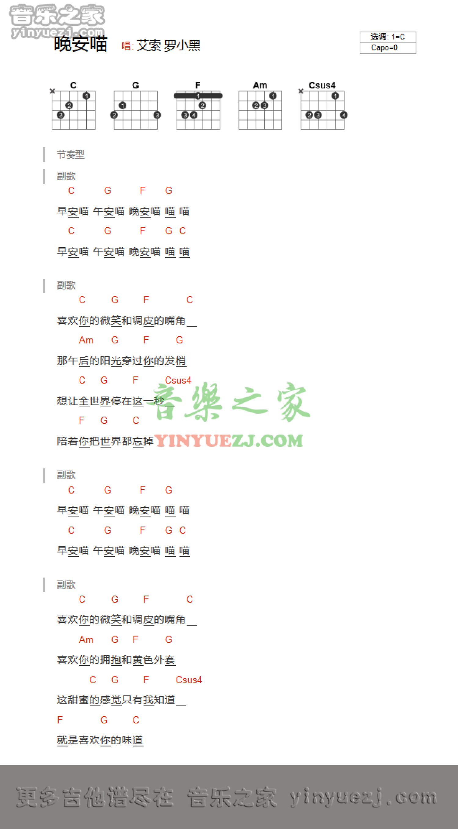 曲谱介绍: 艾索《晚安喵》吉他谱_C调吉他弹唱谱_和弦谱