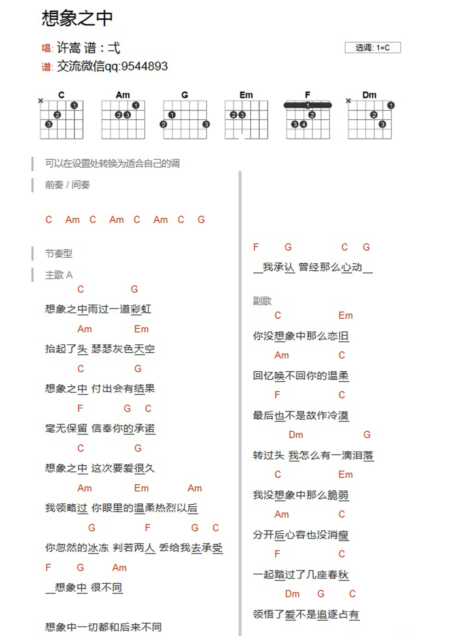 曲谱介绍: 许嵩《想象之中》吉他谱_C调吉他弹唱谱_和弦谱