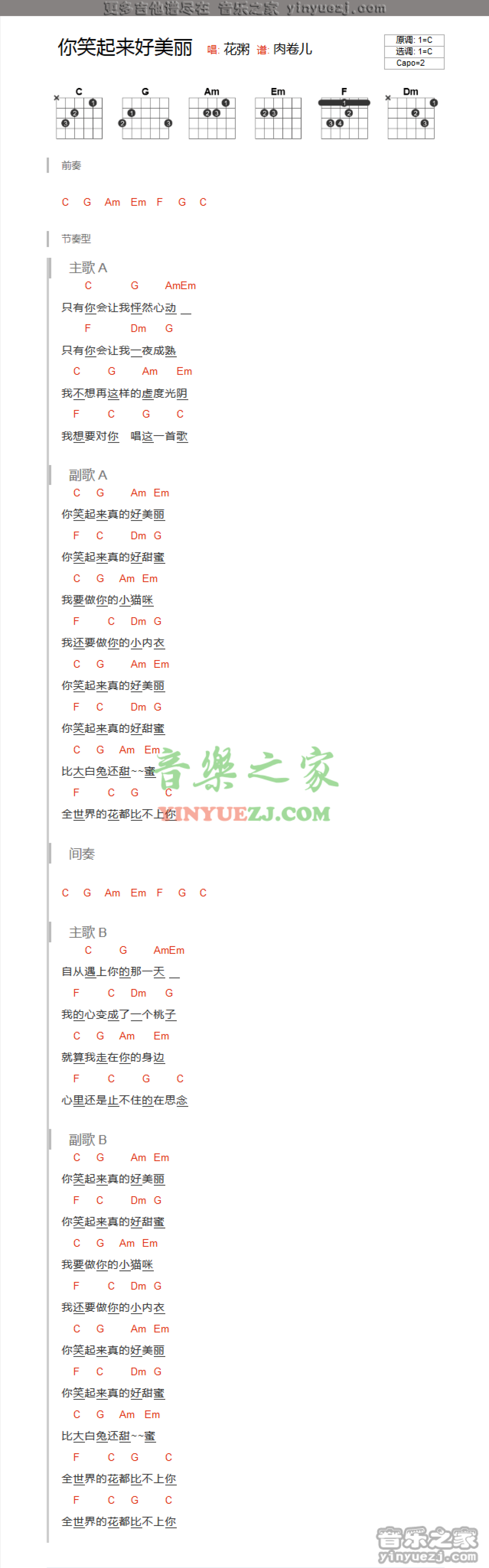 曲谱介绍: 花粥《你笑起来好美丽》吉他谱_C调吉他弹唱谱_和弦谱