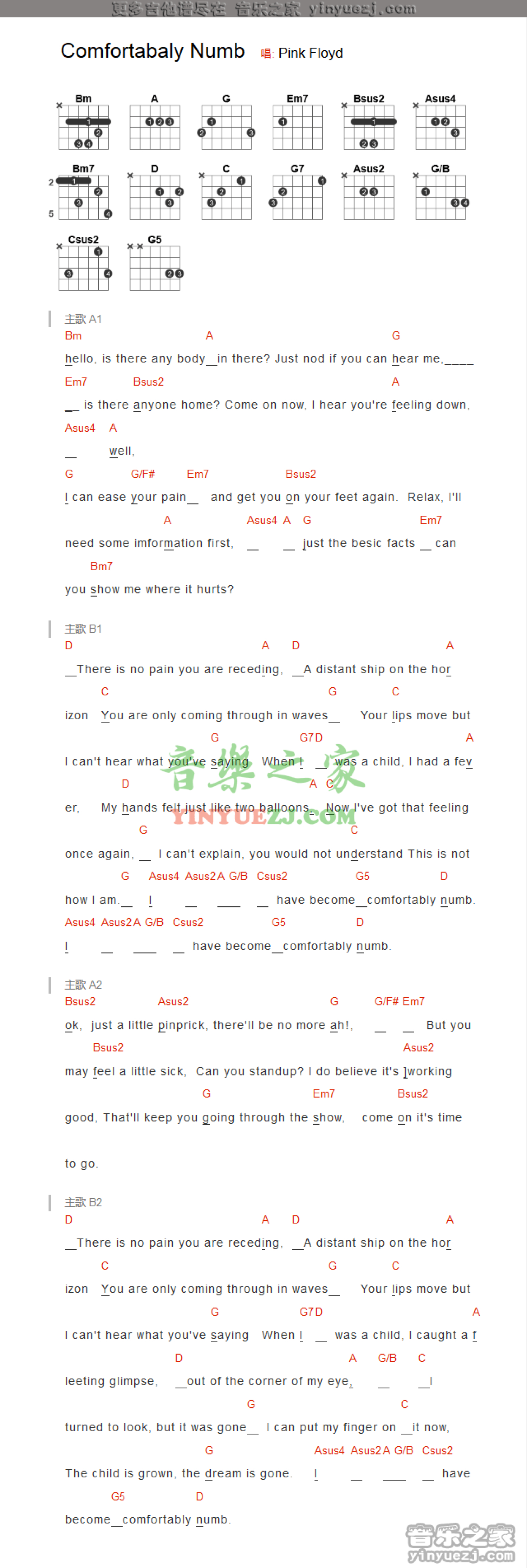 曲谱介绍: Pink Floyd(平克·弗洛依德)《comfortably numb》吉他谱_吉他弹唱谱_和弦谱