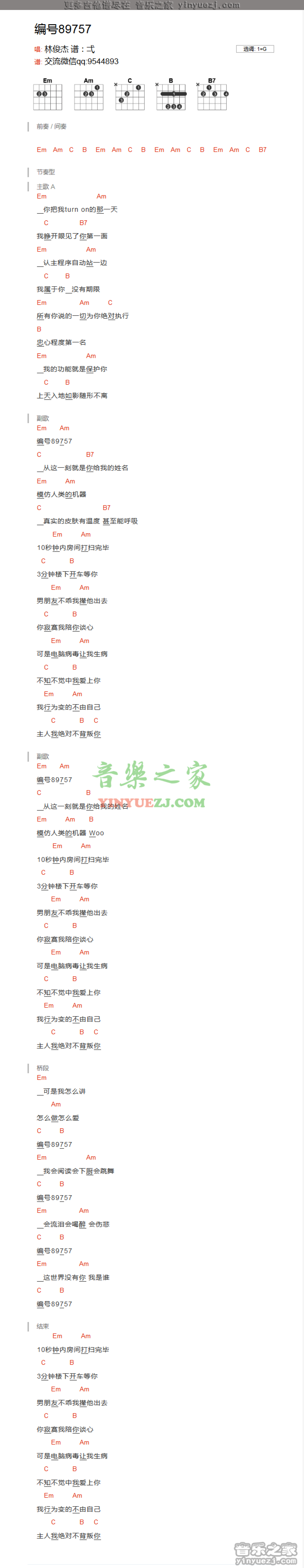 曲谱介绍: 林俊杰《编号89757》吉他谱_G调吉他弹唱谱_和弦谱