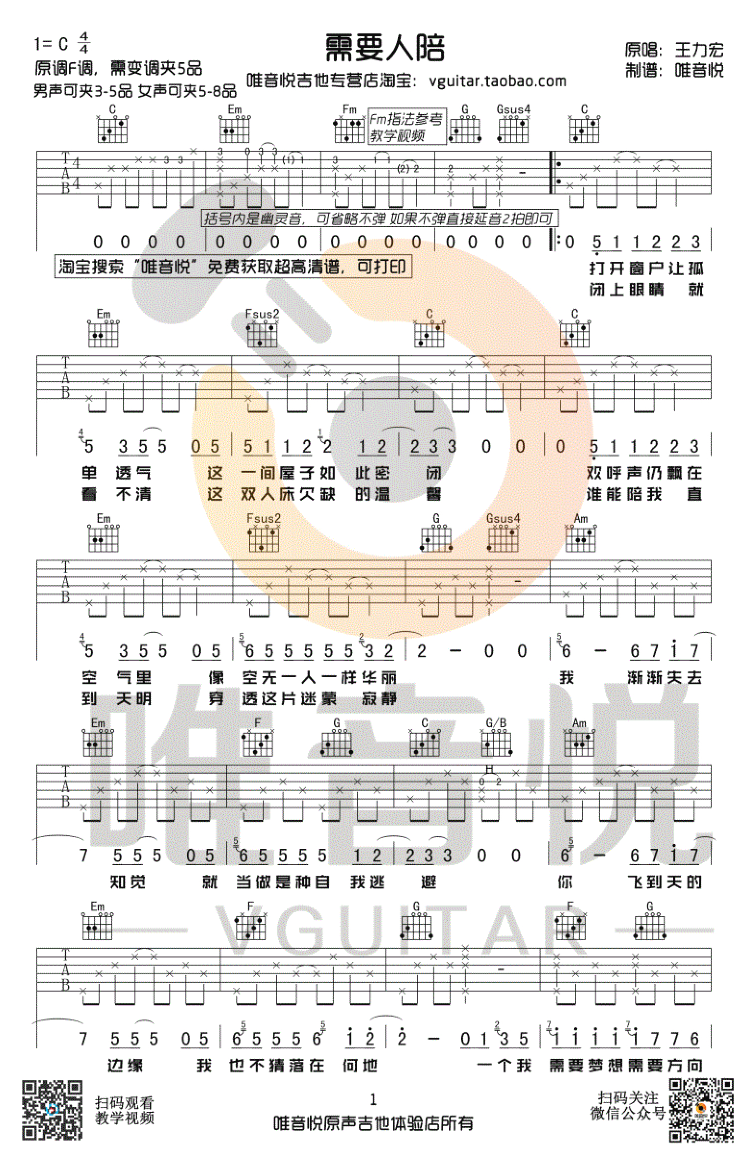 曲谱介绍: 王力宏《需要人陪》吉他谱,C调指法,电影《西虹市首富》插曲,需要人陪吉他弹唱谱,原调F,变调夹夹五品,