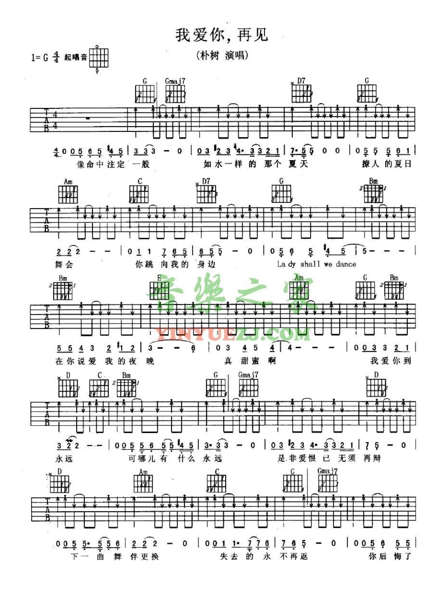 我爱你再见吉他谱 - 朴树 - G调吉他弹唱谱