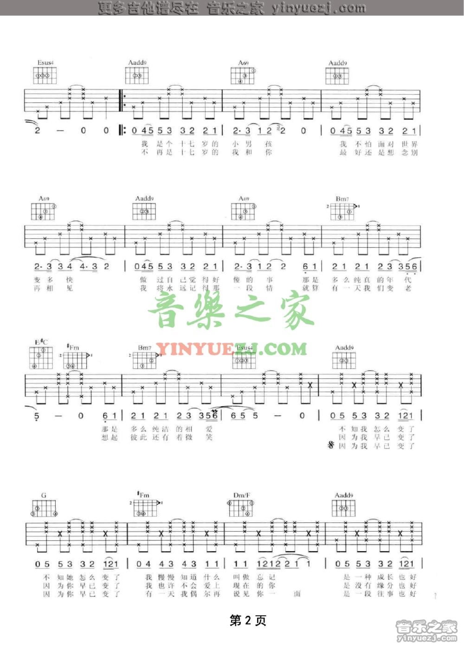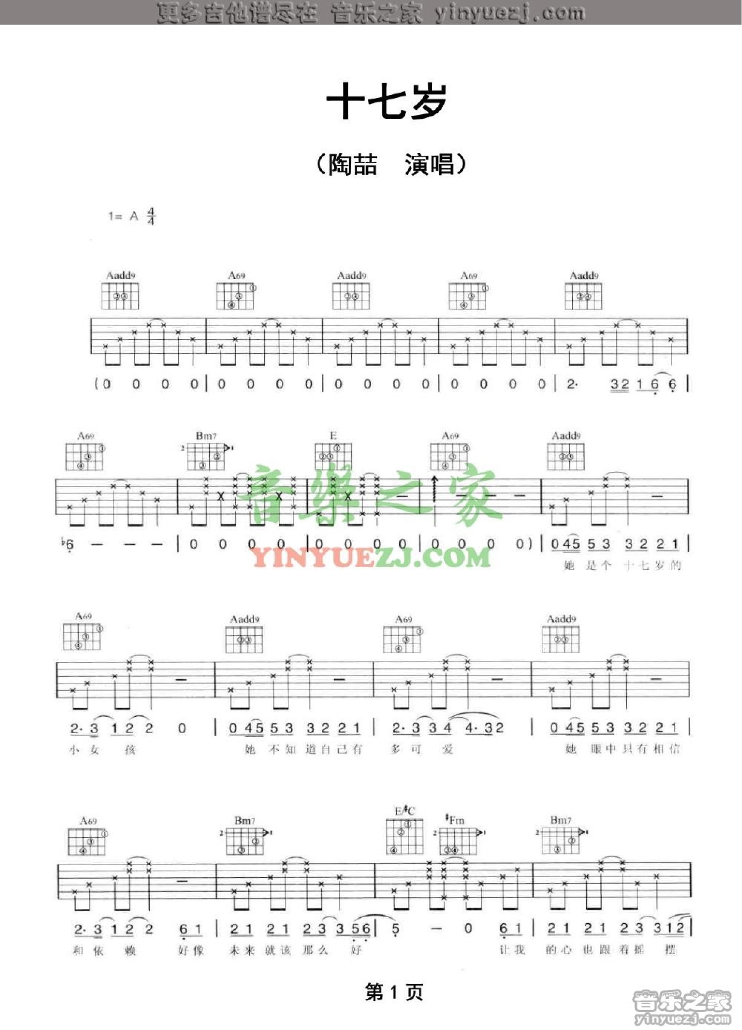 曲谱介绍: 陶喆《十七岁》吉他谱_A调吉他弹唱谱