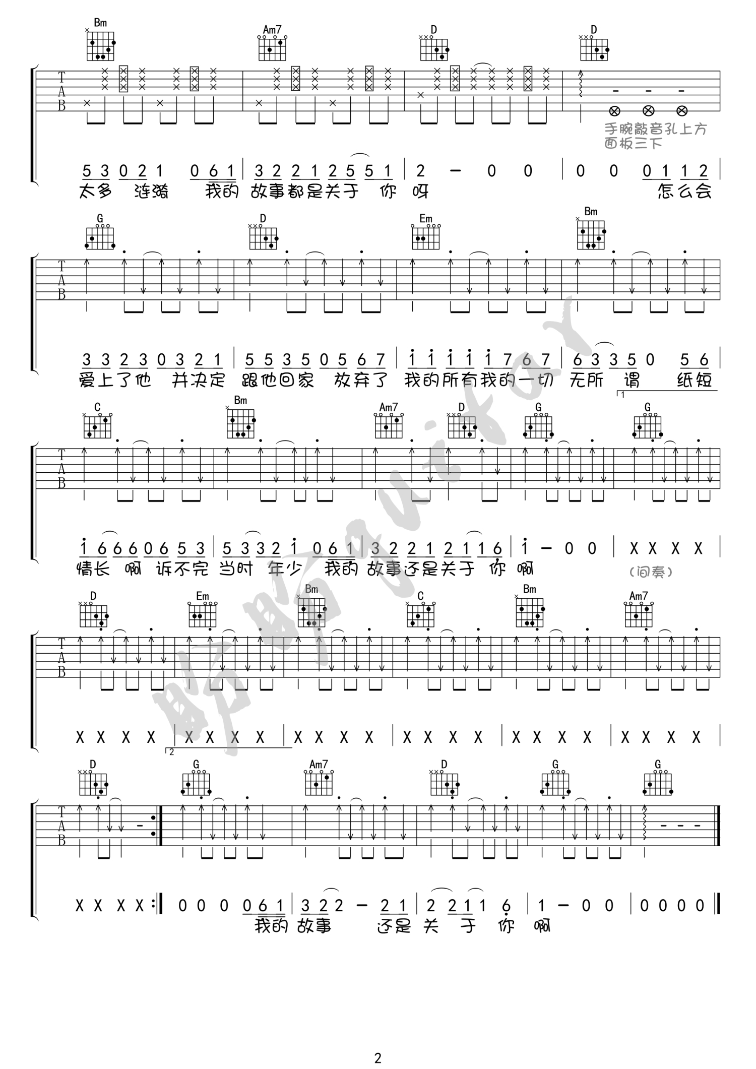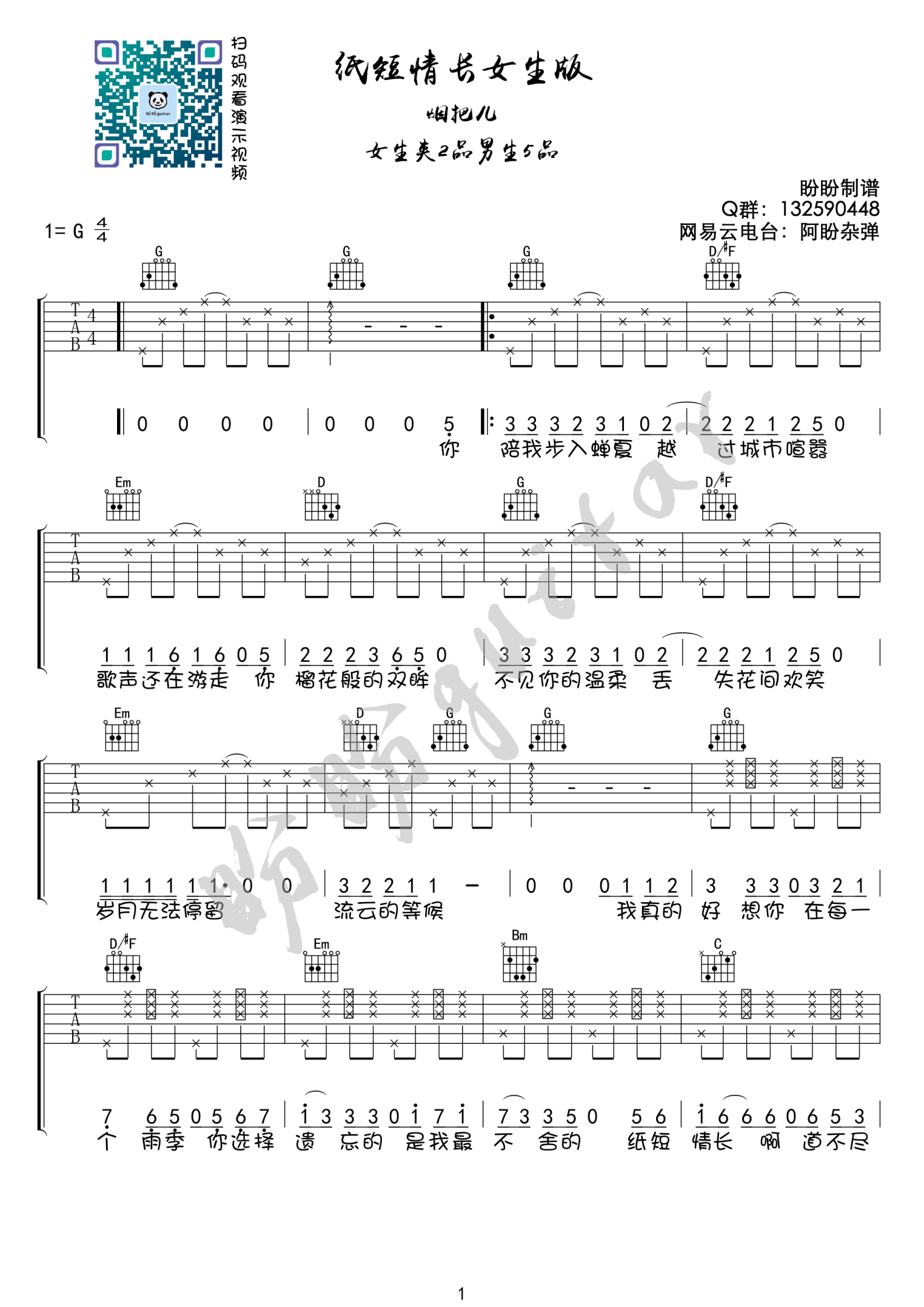 曲谱介绍: 《纸短情长》女生版吉他谱