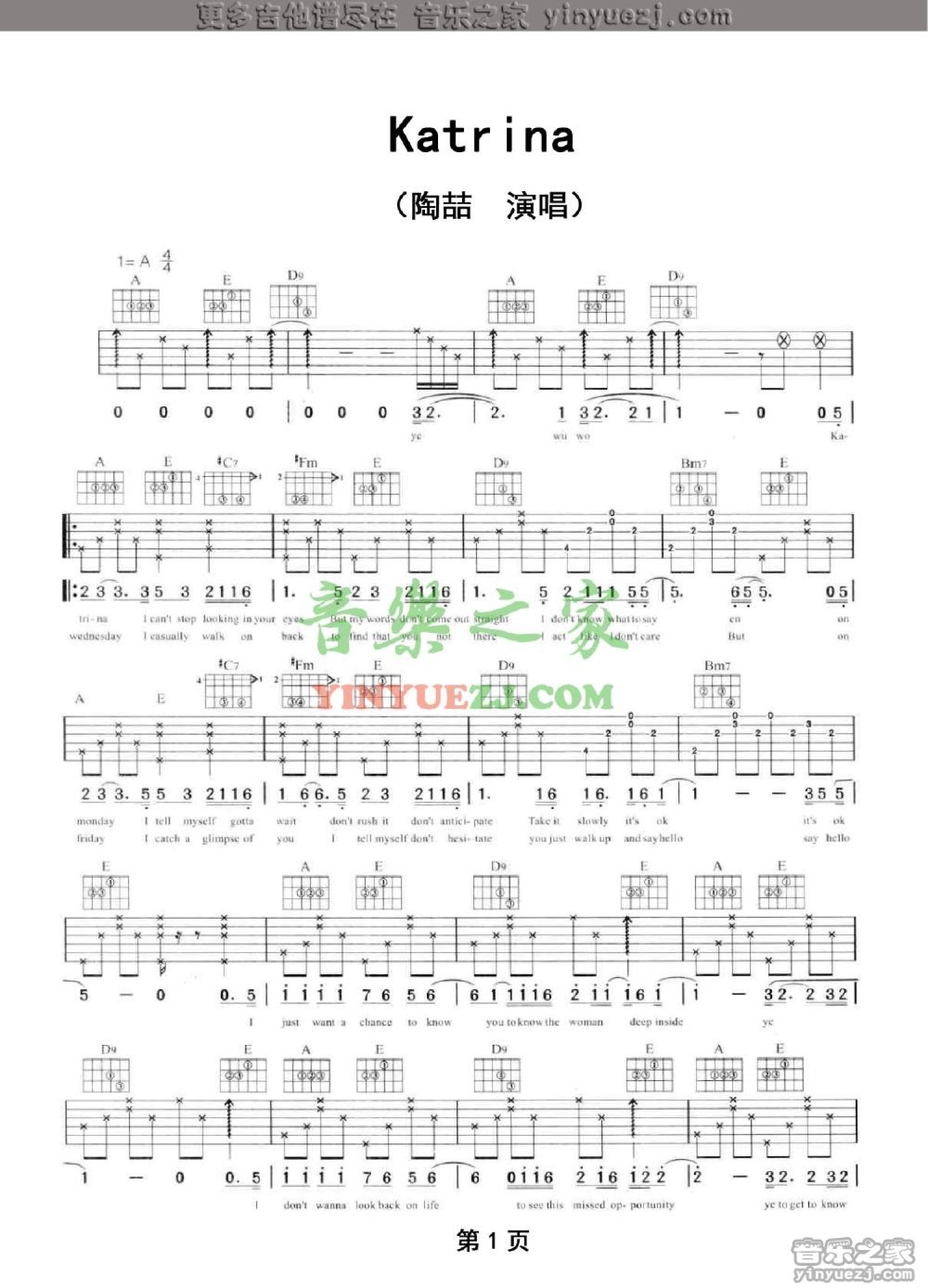 曲谱介绍: 陶喆《Katrina》吉他谱_A调吉他弹唱谱