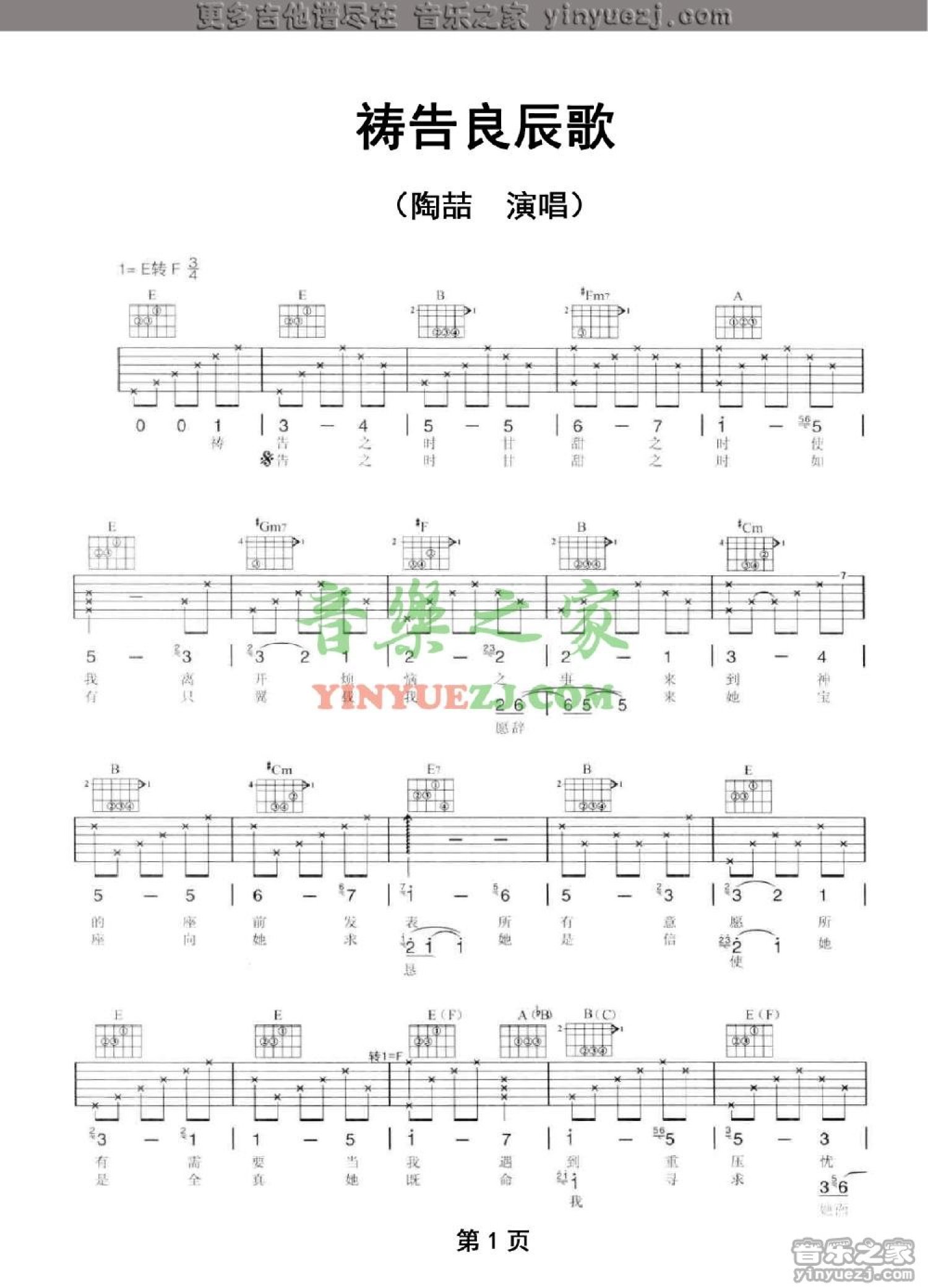 曲谱介绍: 陶喆《祷告良辰歌》吉他谱_E调吉他弹唱谱
