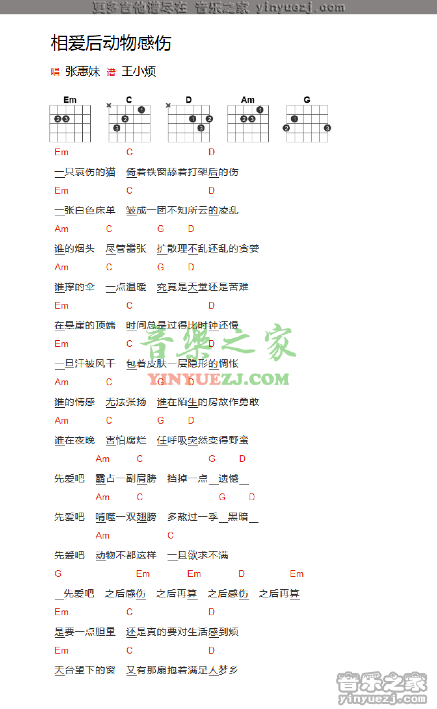 相爱后动物感伤吉他谱 - 张惠妹 - 吉他弹唱谱 - 和弦谱