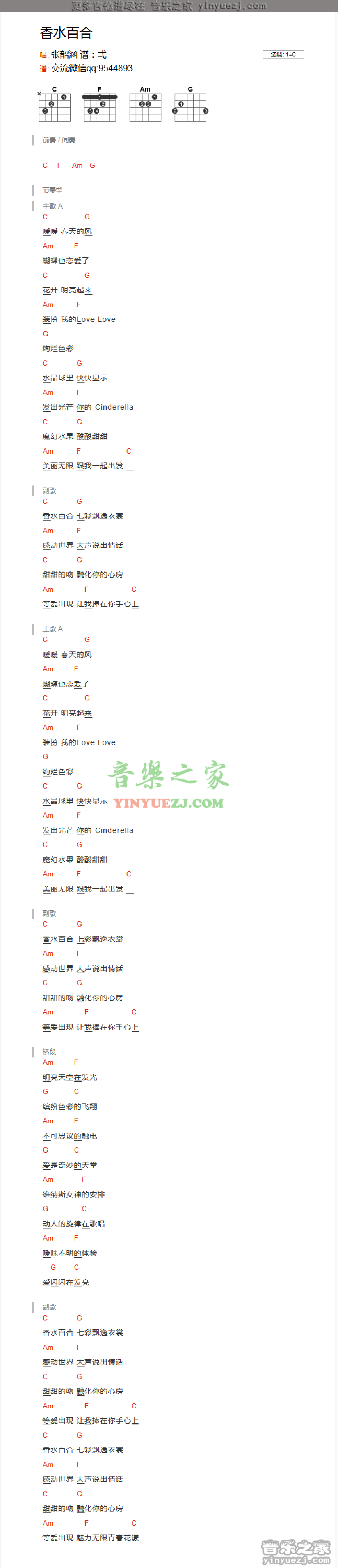 香水百合吉他谱 - 张韶涵 - C调吉他弹唱谱 - 和弦谱