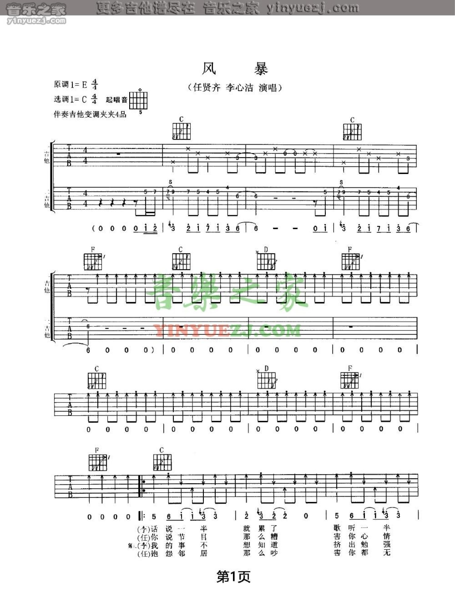 风暴吉他谱 - 任贤齐/李心洁 - C调吉他弹唱谱