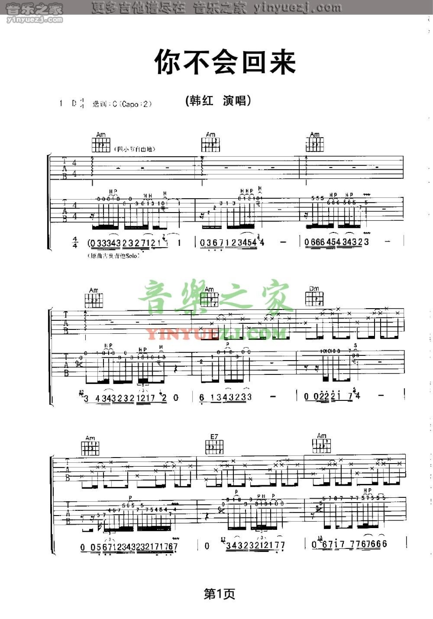 曲谱介绍: 韩红《你不会回来》吉他谱