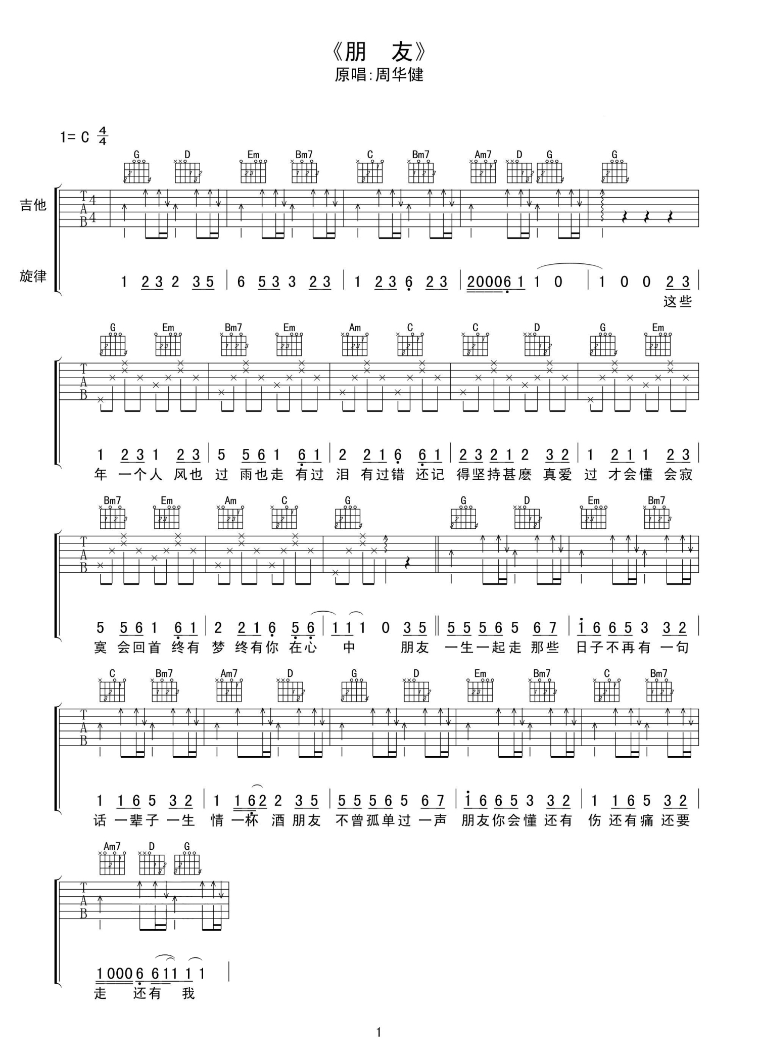 曲谱介绍: 周华健《朋友》吉他谱 C调扫弦版