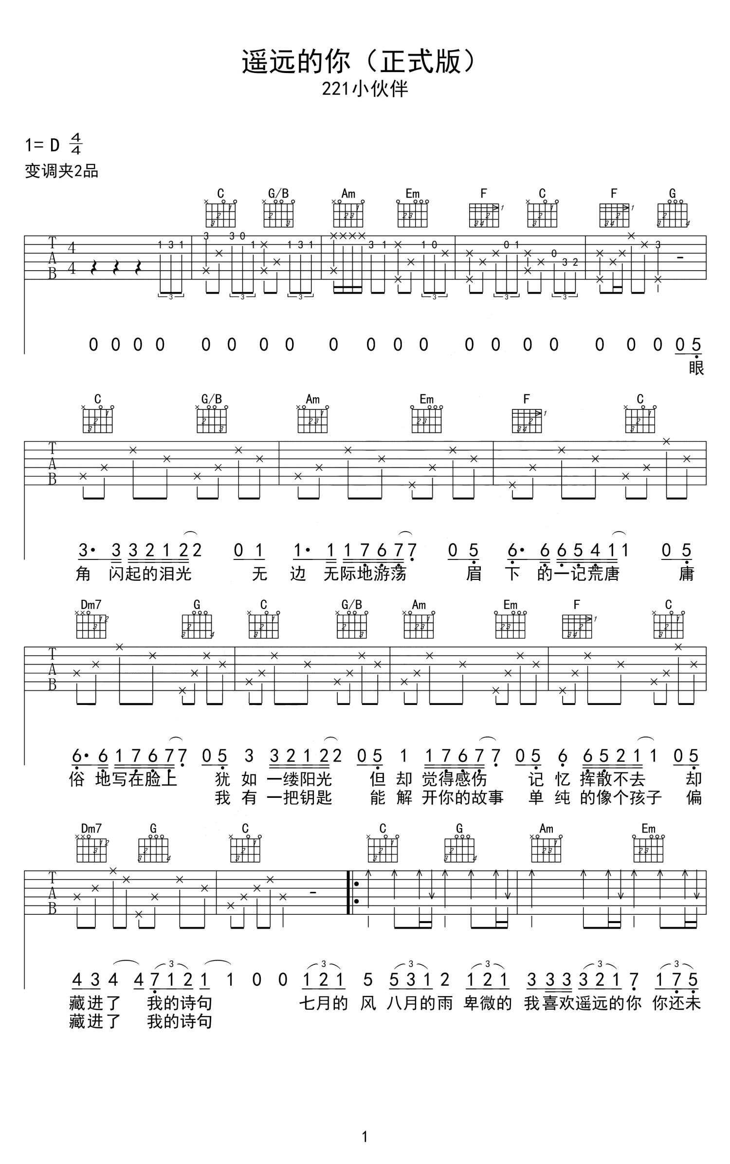 遥远的你吉他谱 - 221小伙伴 - D调吉他弹唱谱