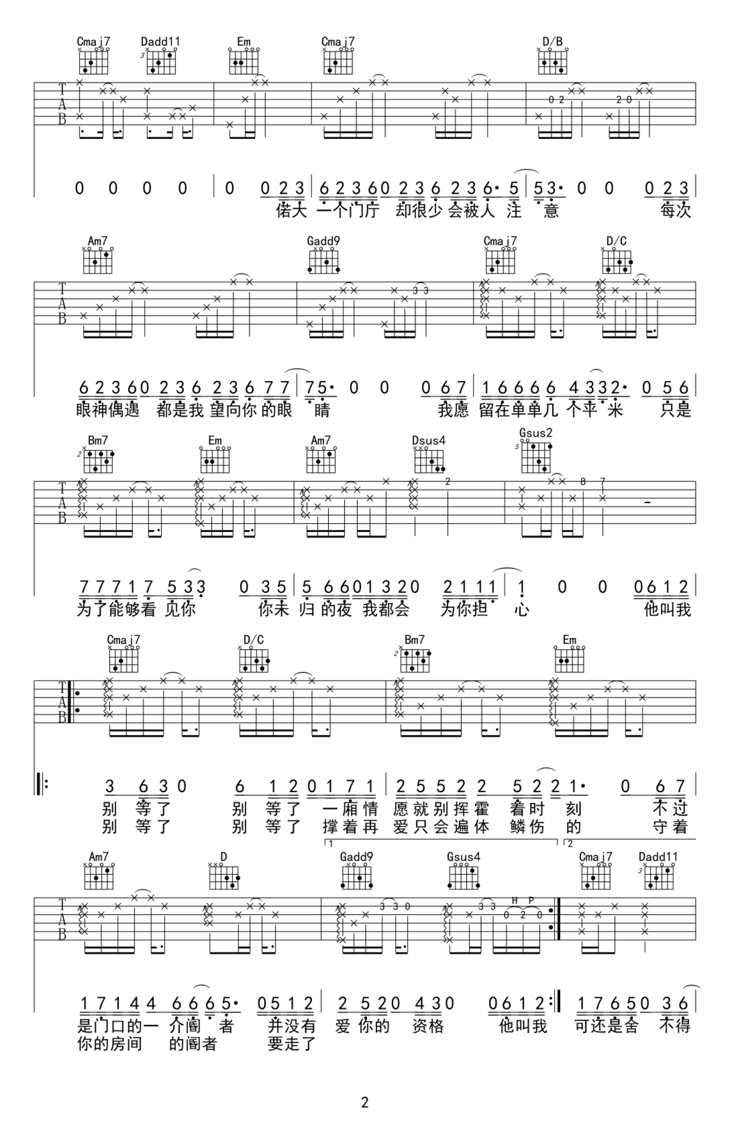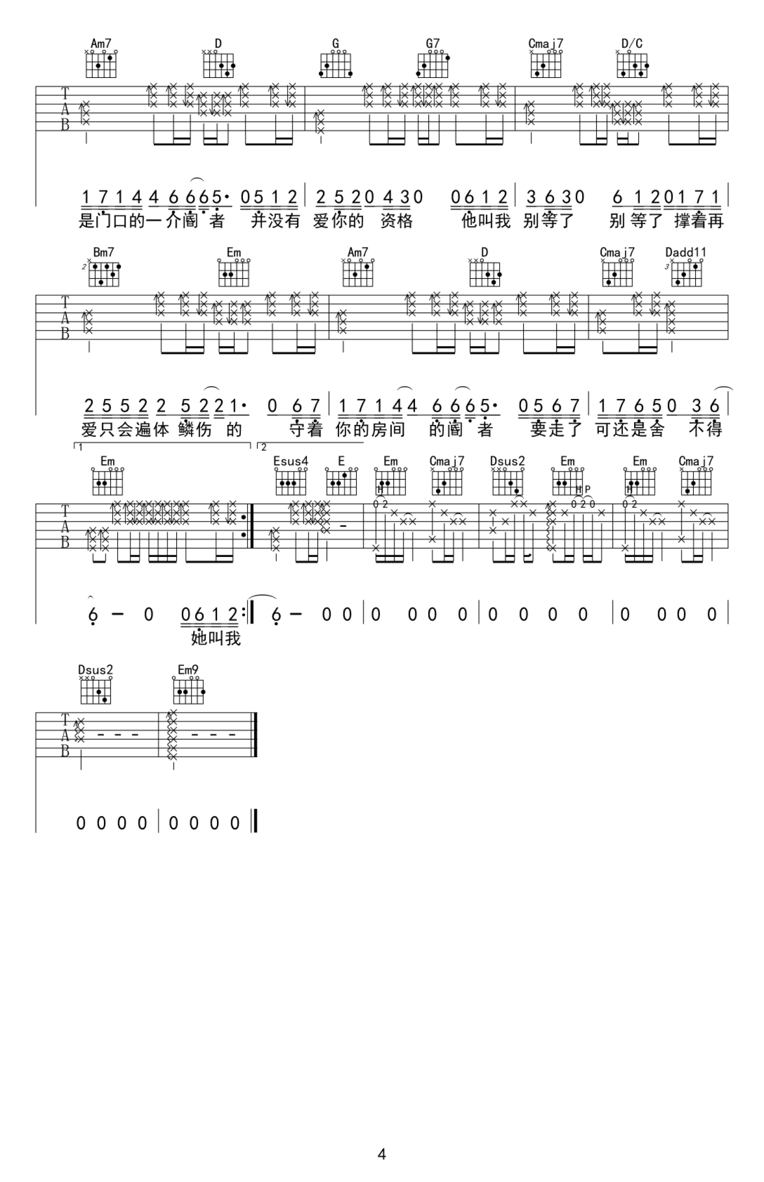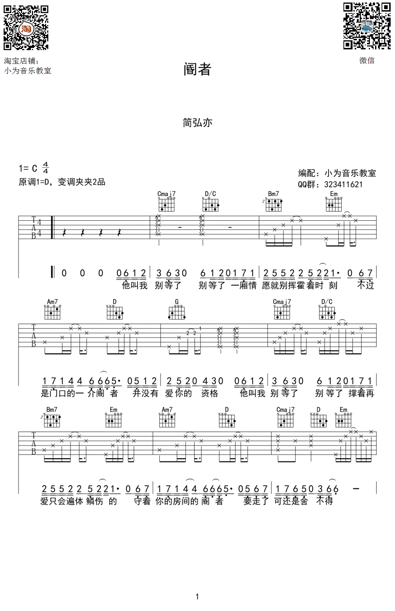 曲谱介绍: 简弘亦《阍者》吉他谱,选用C调指法,变调夹夹第二品,阍者即为守门的人的意思,简弘亦在歌声里诠释了爱情的守候与一厢情愿的苦涩。卑微而深沉的爱着一个人,就算自作多情,只为能够看到他,陪伴他,守着这无尽漫漫长夜,为对方留着一扇心门。