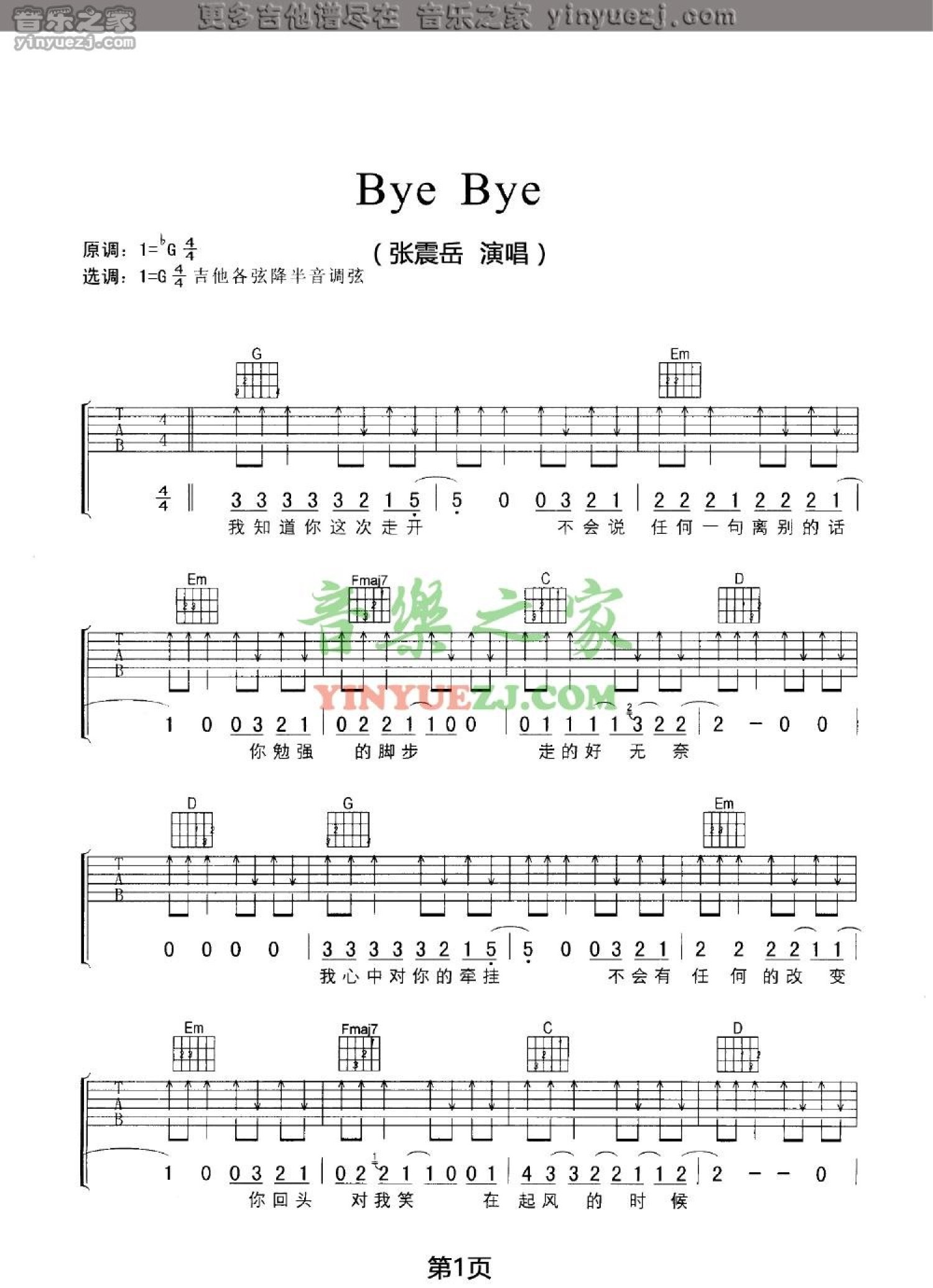 bye bye吉他谱 - 张震岳 - G调吉他弹唱谱
