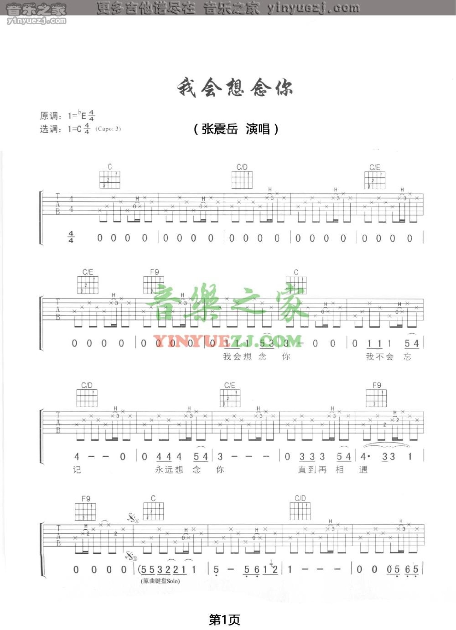 曲谱介绍: 张震岳《我会想念你》吉他谱