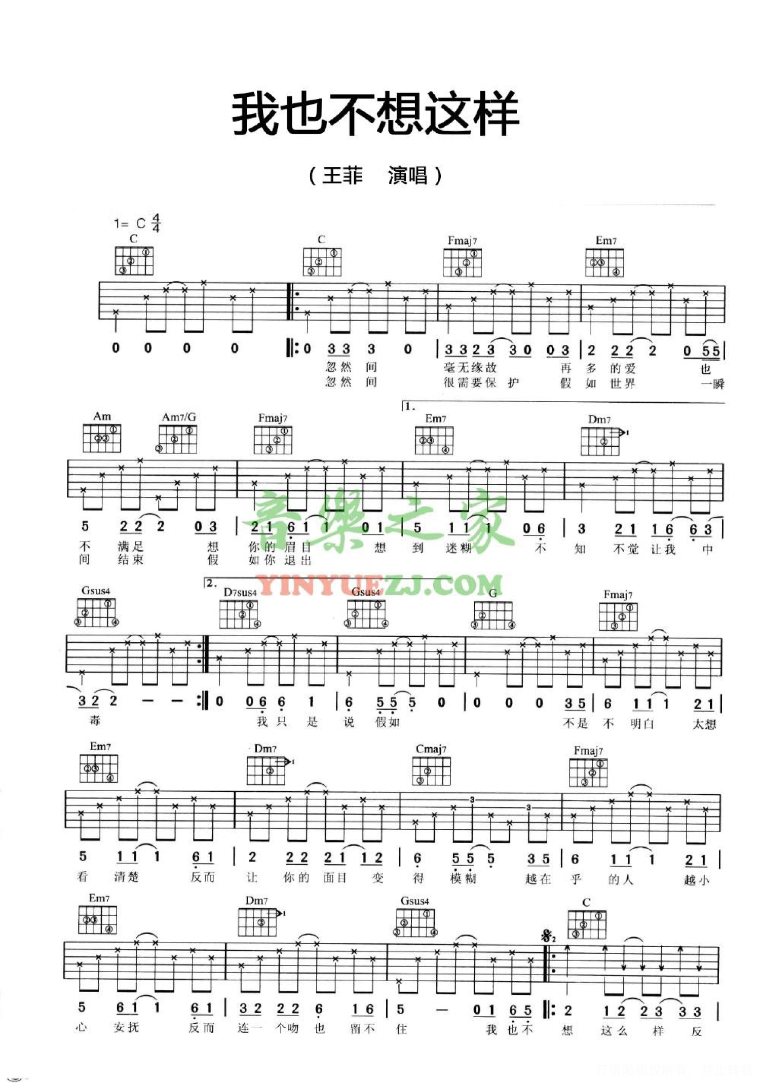 我也不想这样吉他谱 - 王菲 - C调吉他弹唱谱 - 扫弦版