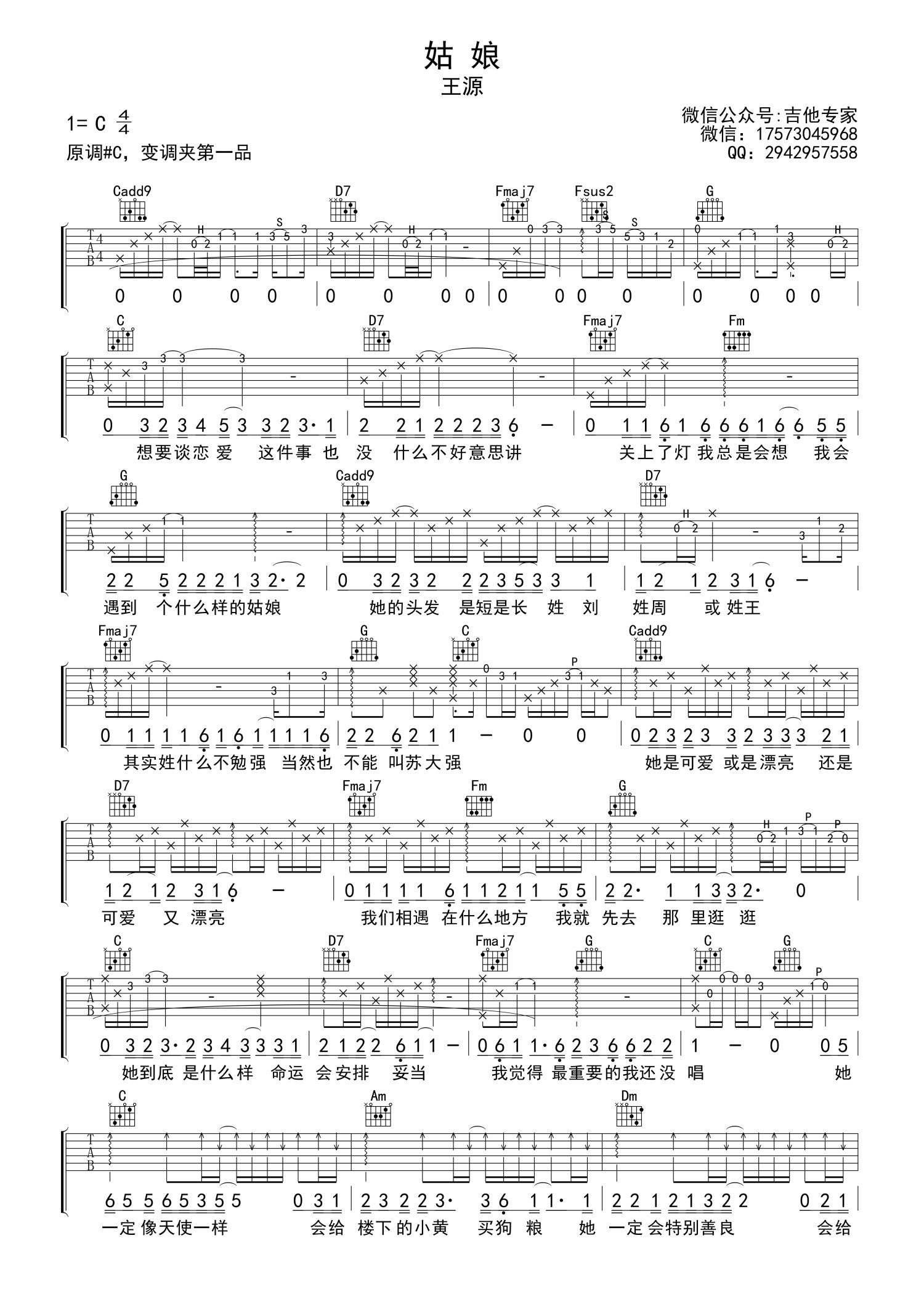 曲谱介绍: 王源《姑娘》吉他谱_C调吉他弹唱谱