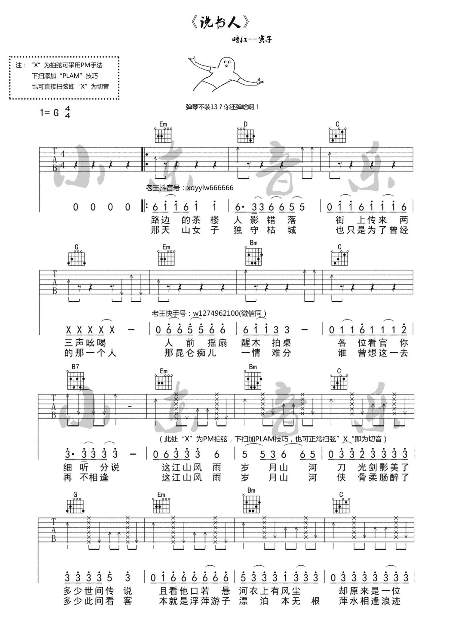 曲谱介绍: 暗杠寅子《说书人》吉他谱,G调弹唱谱,一首网络热门歌曲,道尽人生沧桑。曲谱中X为拍弦可采用PM手法,下扫添加PLAM技巧,也可直接扫弦即X为切音。