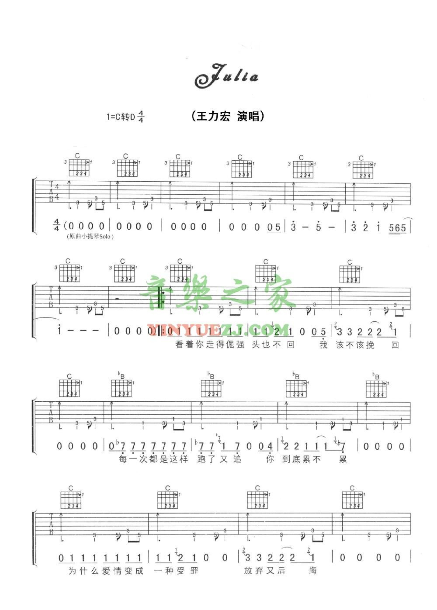 julia吉他谱 - 王力宏 - C调吉他弹唱谱