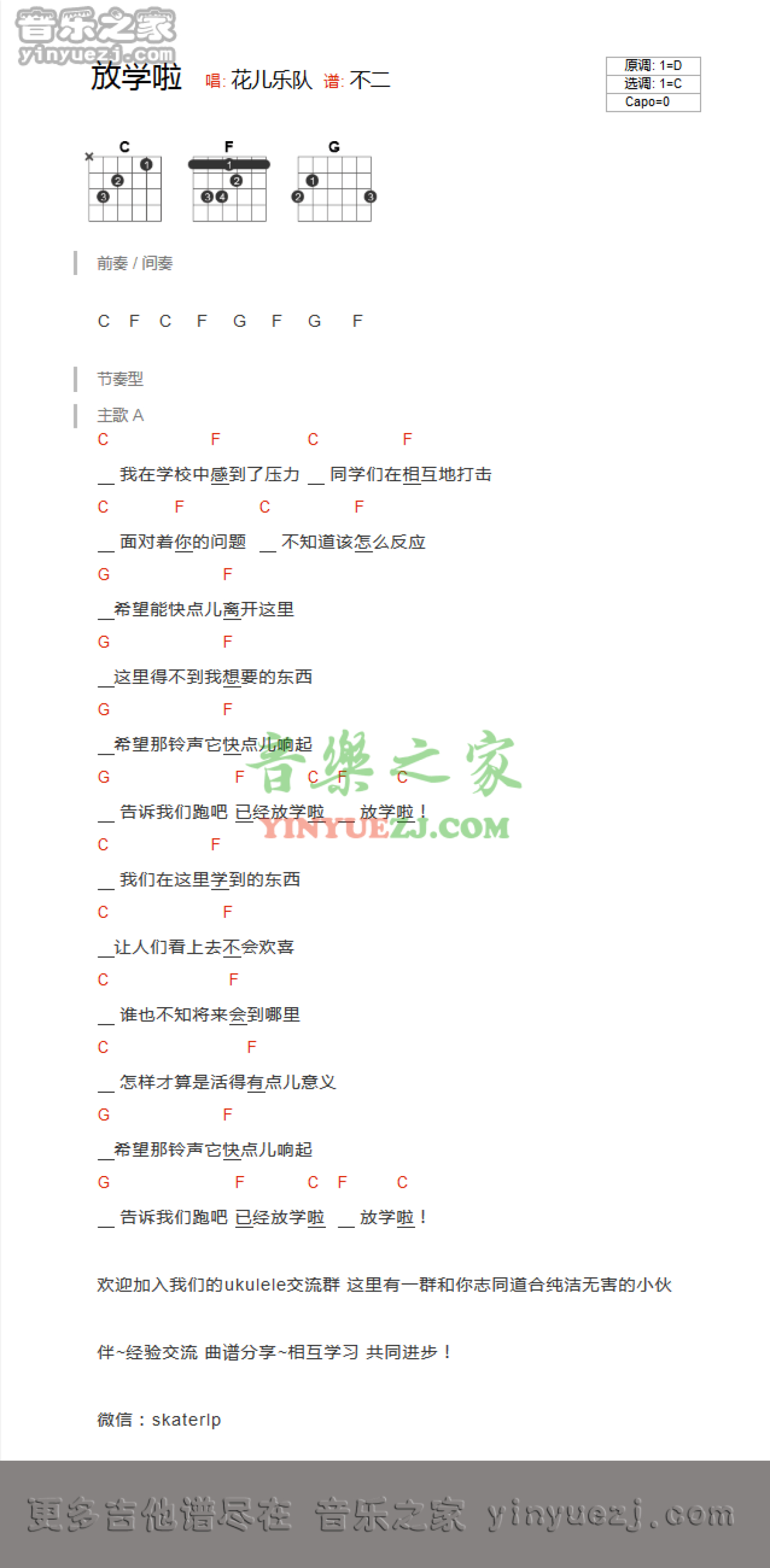 放学啦吉他谱 - 花儿乐队 - C调吉他弹唱谱 - 和弦谱