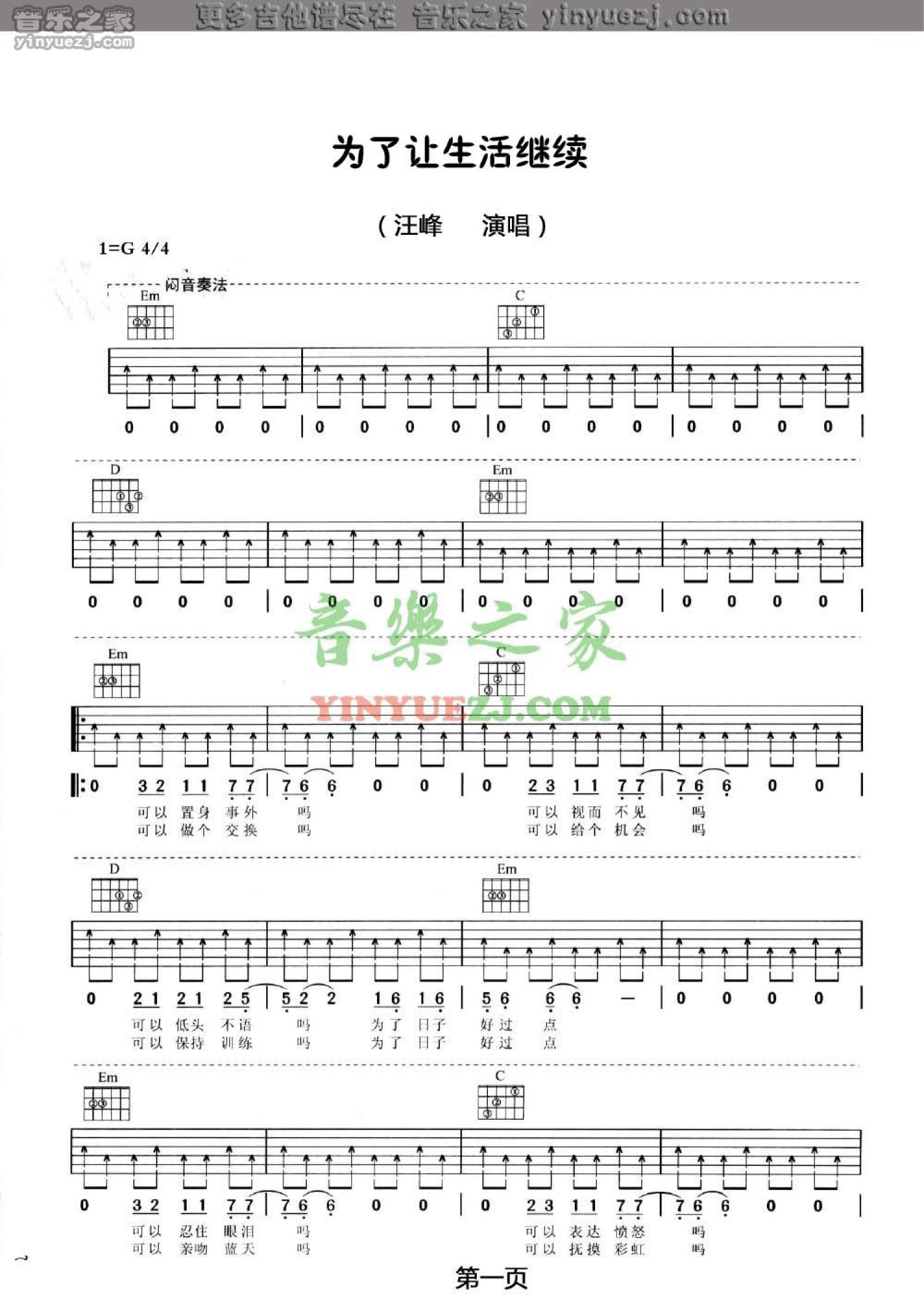 为了让生活继续吉他谱 - 汪峰 - G调吉他弹唱谱