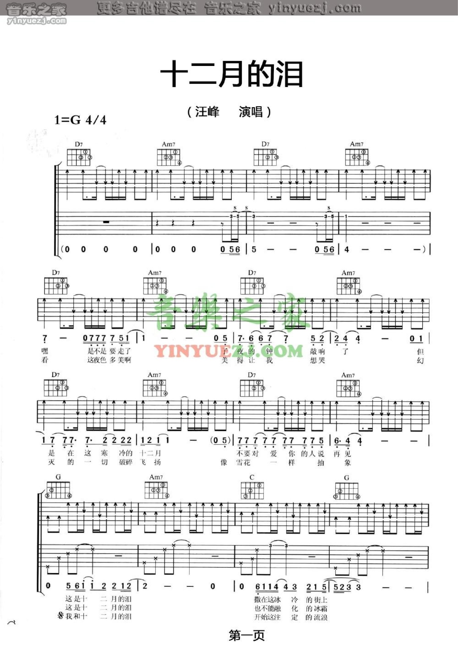 十二月的泪吉他谱 - 汪峰 - G调吉他弹唱谱