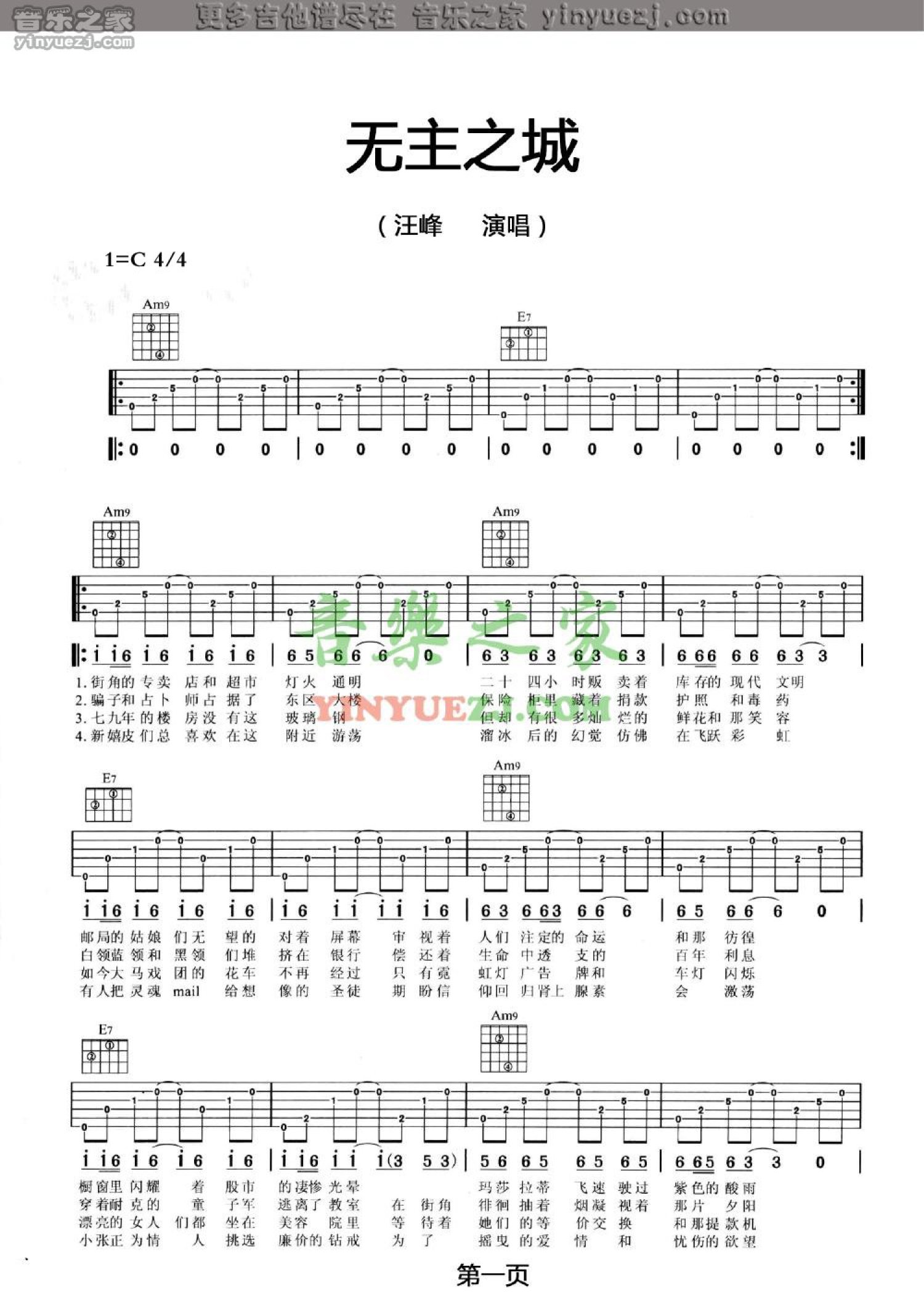 曲谱介绍: 汪峰《无主之城》吉他谱