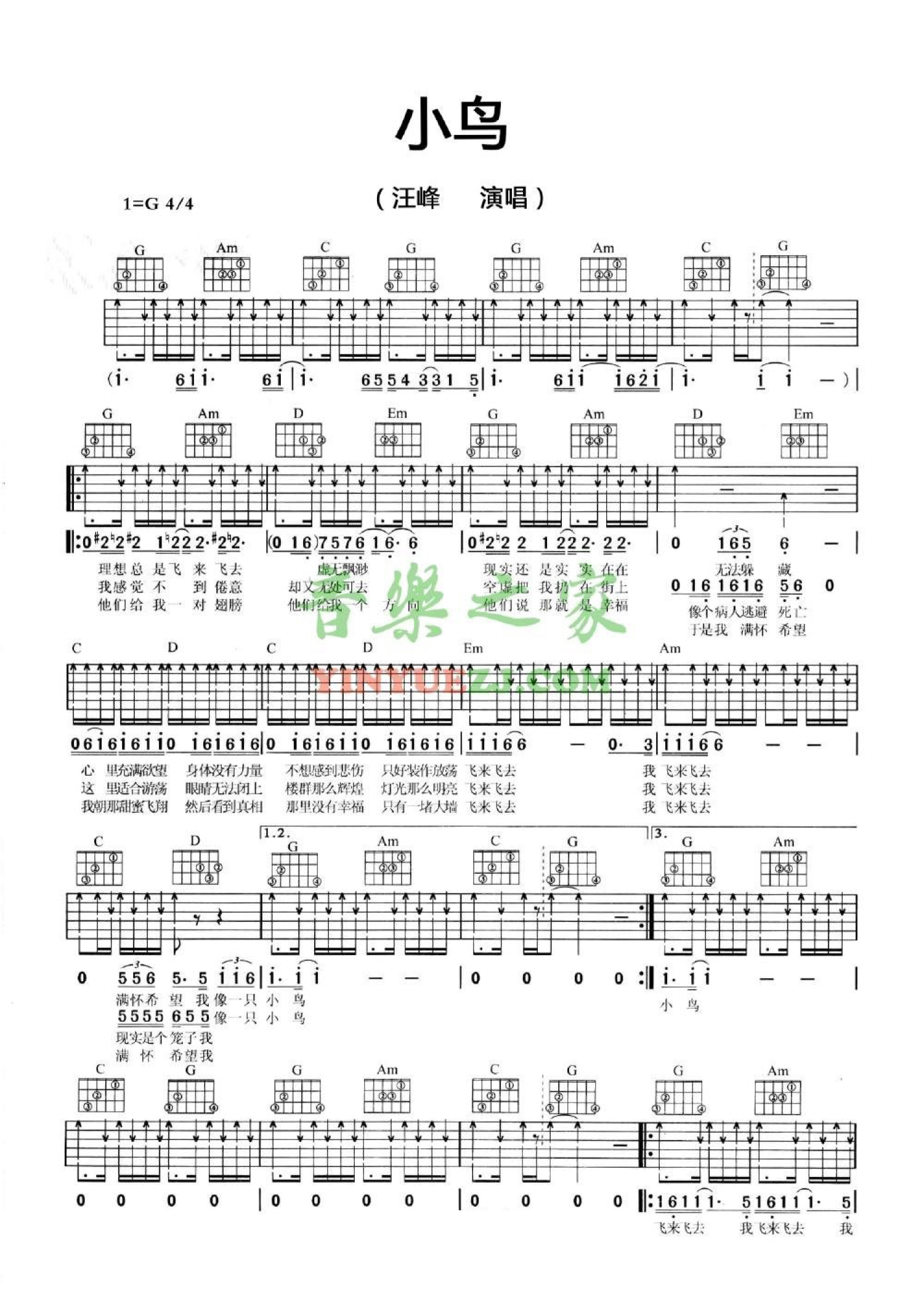 小鸟吉他谱 - 汪峰 - G调吉他弹唱谱