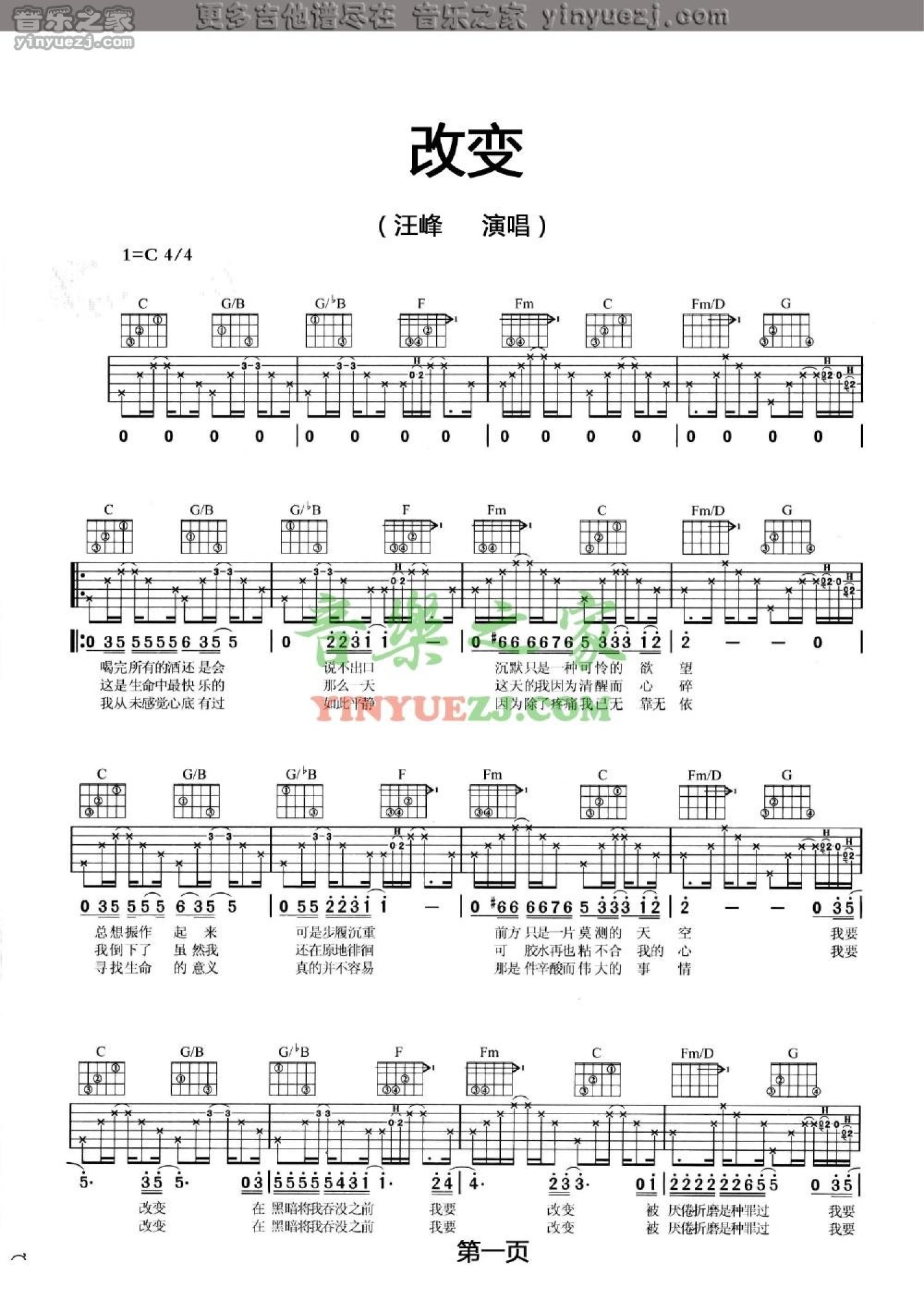 改变吉他谱 - 汪峰 - C调吉他弹唱谱